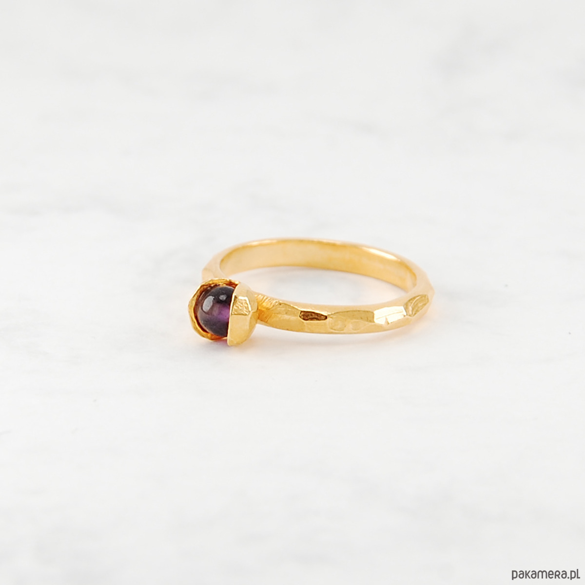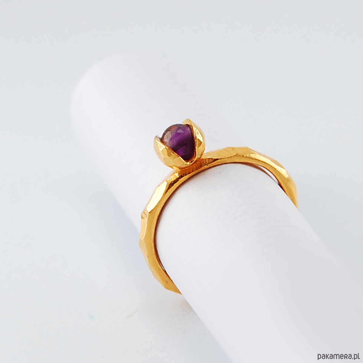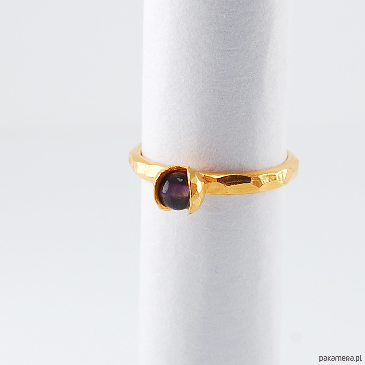 Pierścionek mini KONWALIA jest wykonany ze srebra próby 925 w matowym fasetowanym wykończeniu oraz błyszczącego ametystu. Pokryty jest złoceniem żółtym o grubości 2mikronów oraz zabezpieczony nanopowłoką chroniącą złocenie przedś cieraniem.