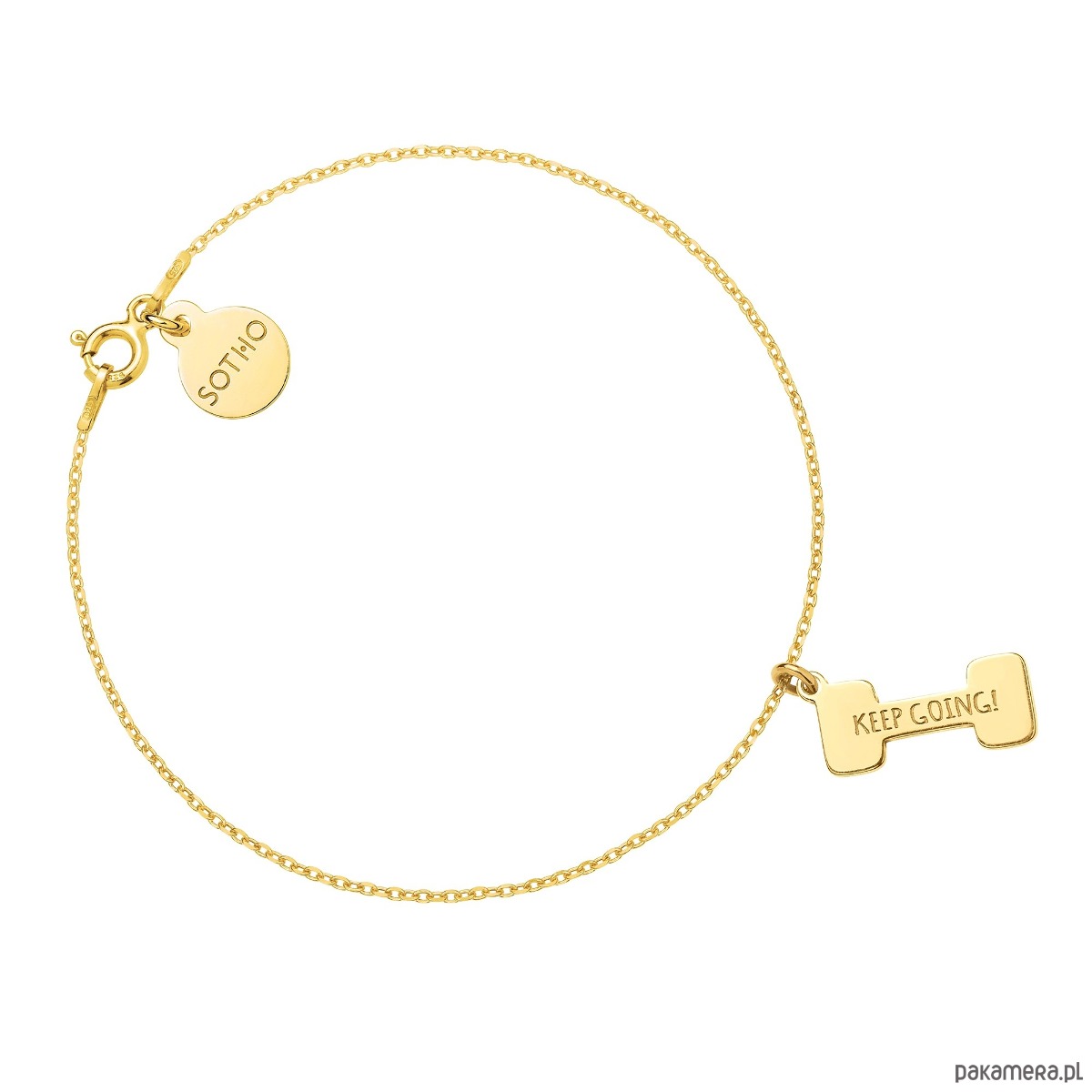 Złota bransoletka łańcuszkowa zdobiona ciężarkiem i zawieszką z logo marki. Całość wykonana ze srebra 925 powlekanego 24 karatowym żółtym złotem.