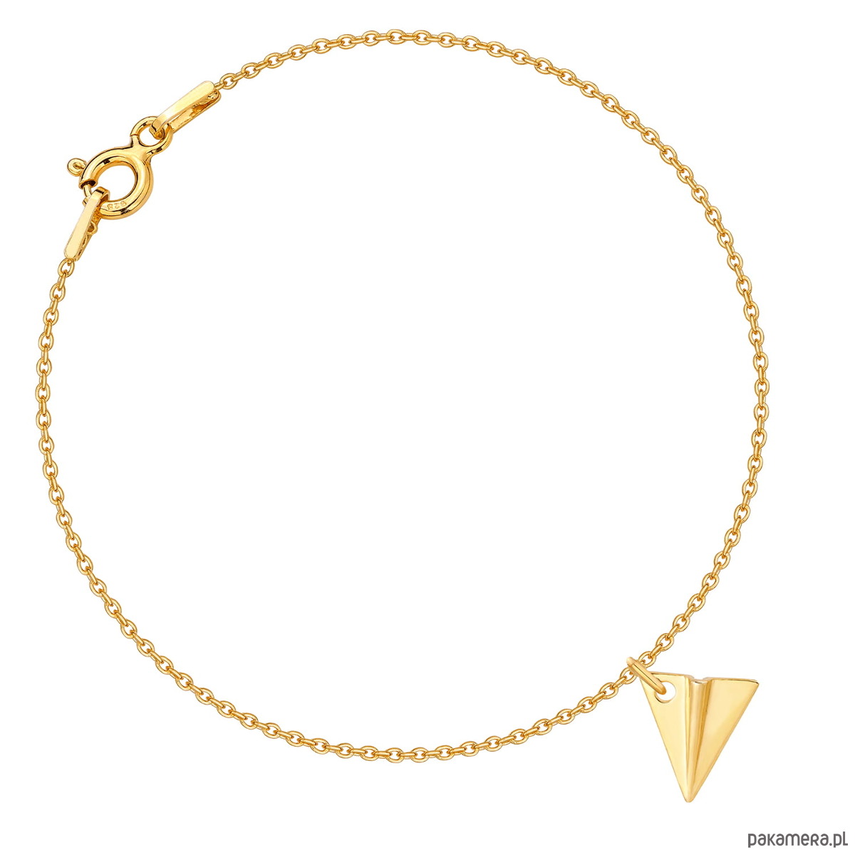 Subtelna, elegancka bransoletka ze srebra próby 925 pozłacanego 24-karatowym złotem.Bransoletka została wykonana z łańcuszka oraz zawieszki w kształcie samolotu z papieru.Metal szlachetny: srebro pozłacanePróba srebra: 925Długość bransoletki: 18 cmGrubość splotu: ~1 mmWielkość zawieszki: ~12 mm
