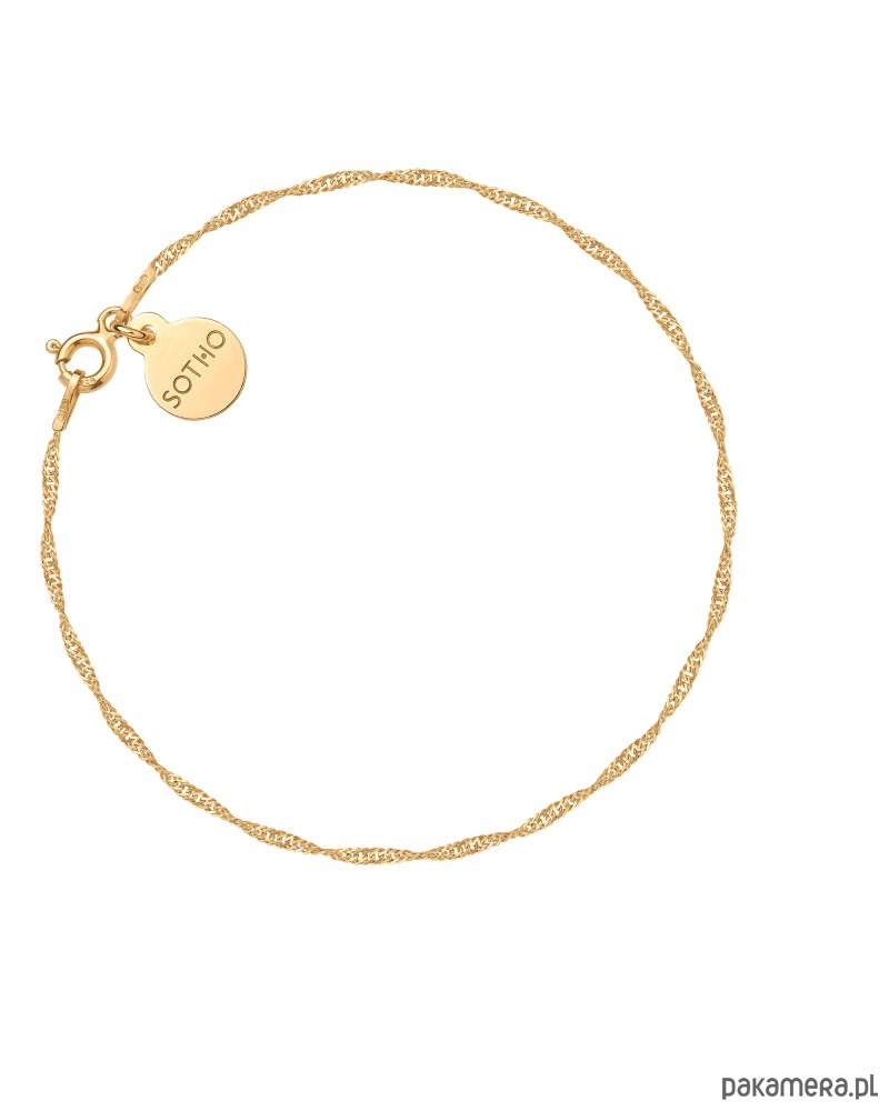 Złota bransoletka typu Singapore oraz zawieszką z logo marki. Całość wykonana ze srebra 925 powlekanego 24 karatowym żółtym złotem.