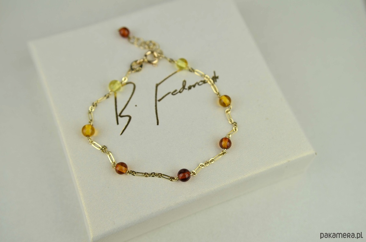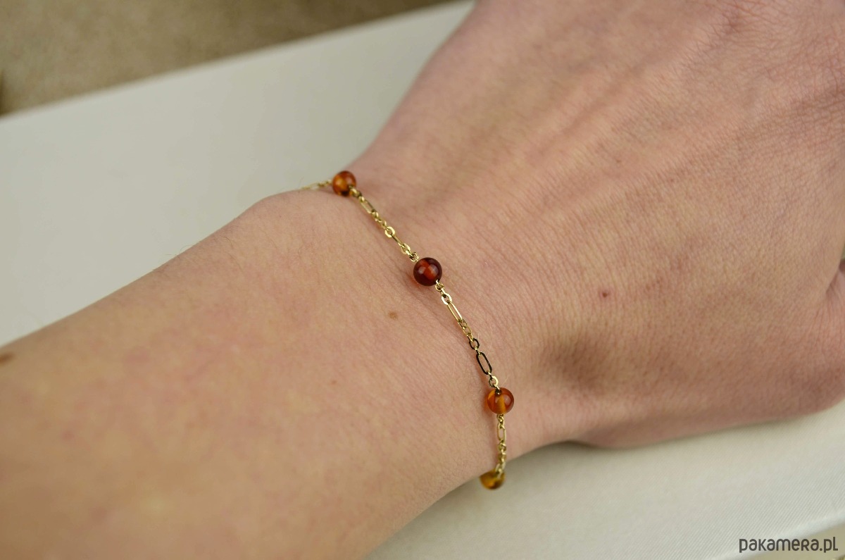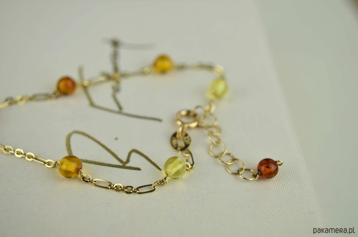 Malutkie kuleczki w różnych odcieniach bursztynu zdobią tę błyszczącą złotą bransoletkę. Żółte złoto świetnie wygląda z ciepłymi barwami bursztynu. Bransoletka wykonana jest z solidnego pełnego łańcuszka i posiada wygodną przedłużkę zakończoną bursztynową kuleczką. Ucieszy kobietę, która lubi mieć bursztynowe ciepło zawsze blisko siebie.