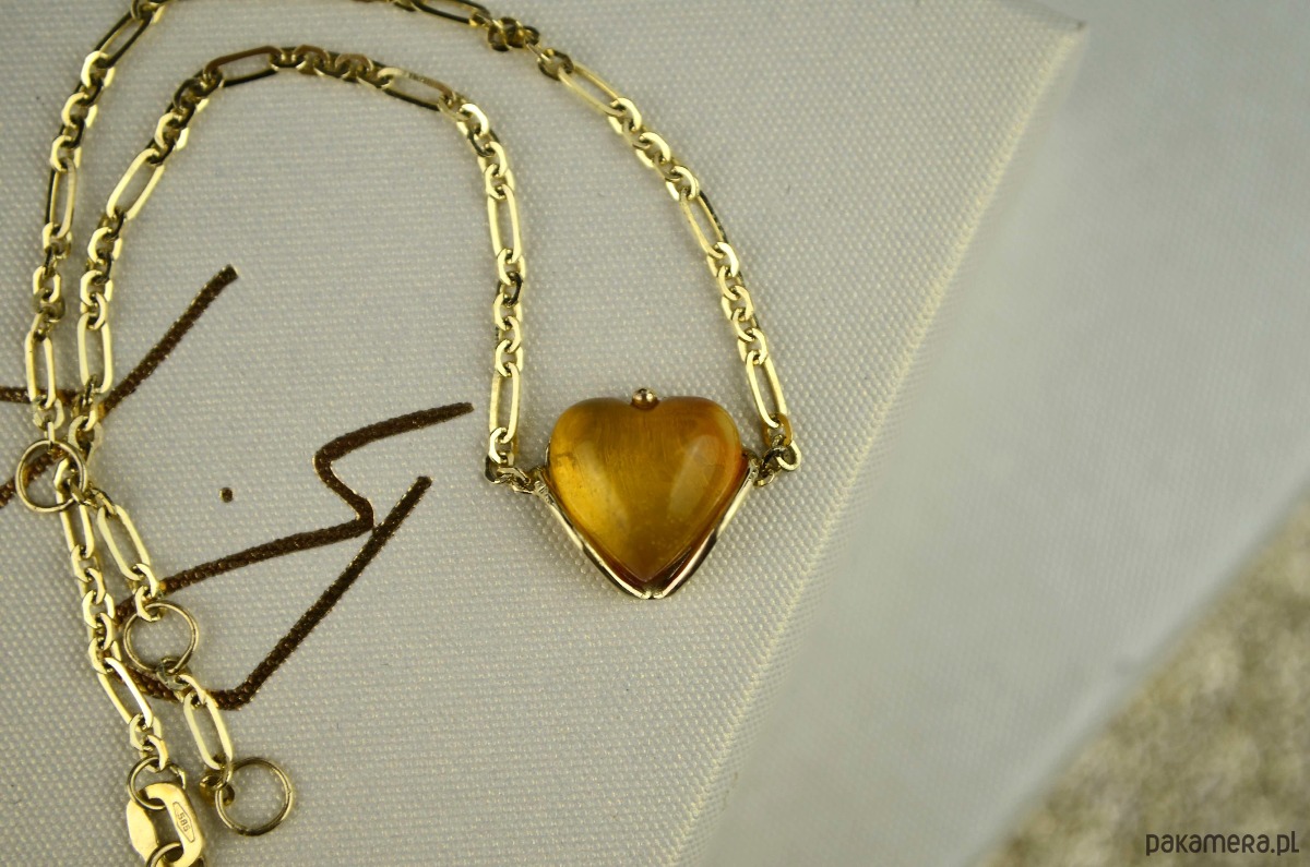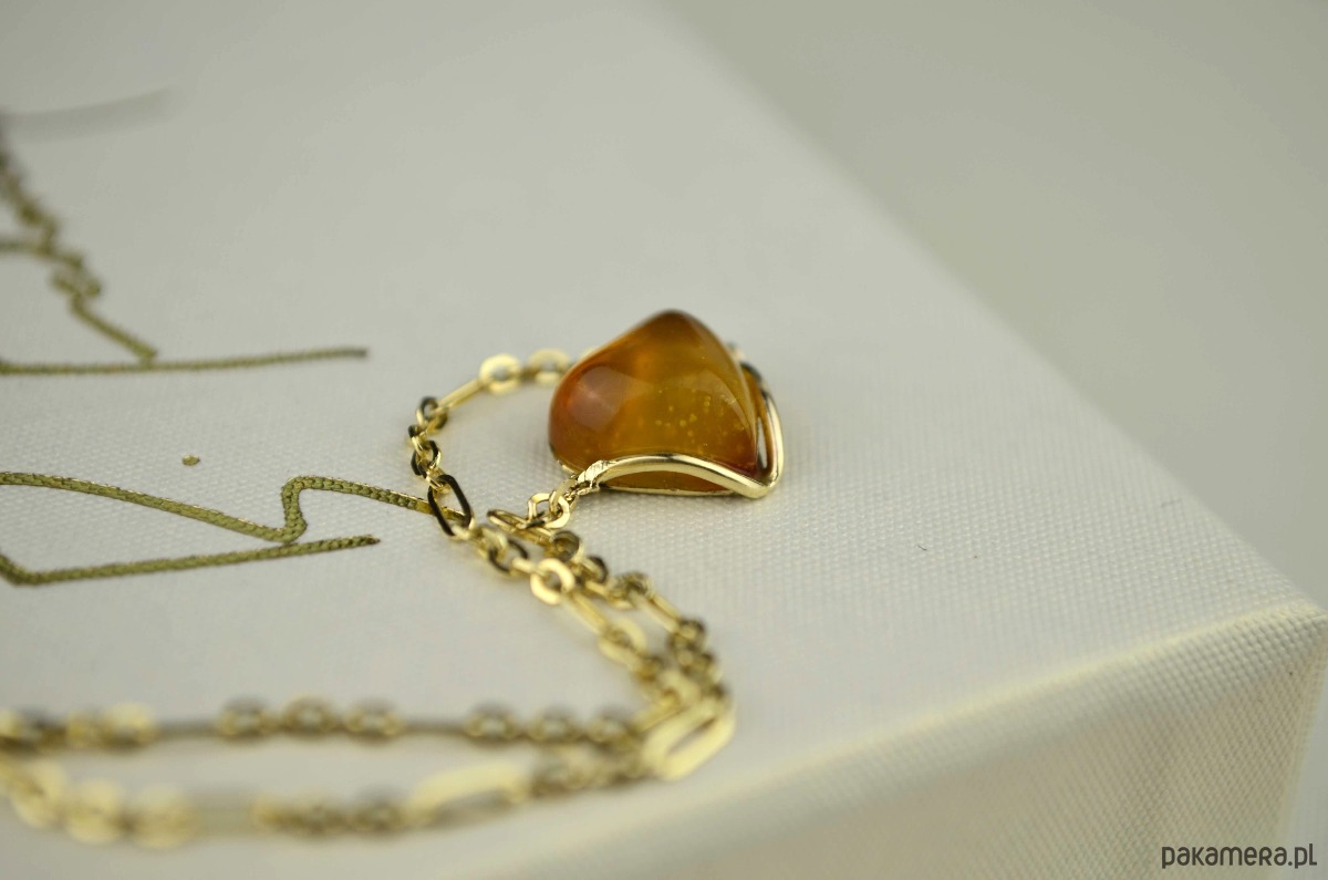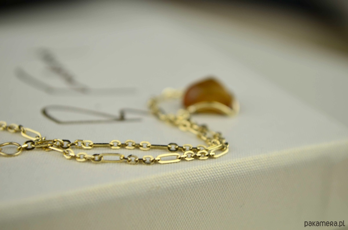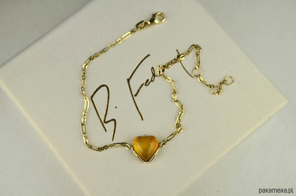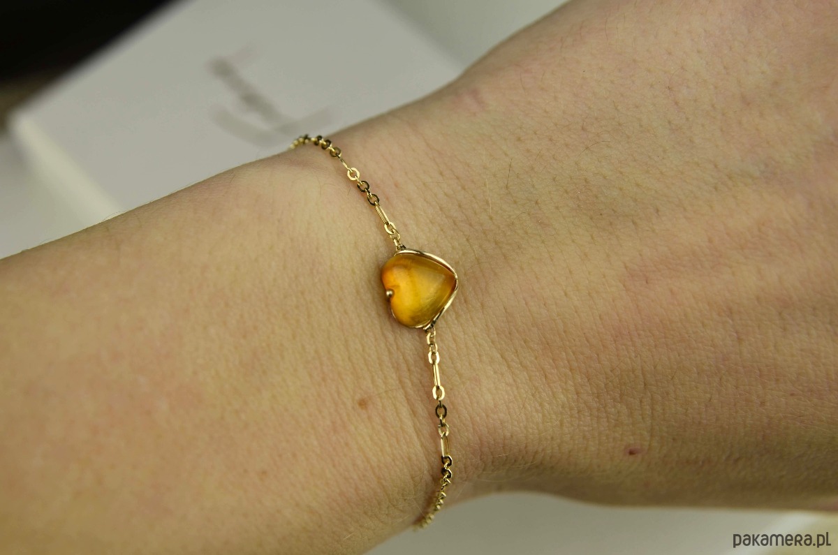 Serce ze słonecznego naturalnego bursztynu połączyłam z żółtym złotem- tak powstała pełna ciepła i blasku bursztynowa bransoletka. Delikatna ażurowa oprawa eksponuje bursztyn. Bransoletka jest wykonana z mocnego pełnego łańcuszka, posiada trzystopniową regulację i solidną zapinkę.