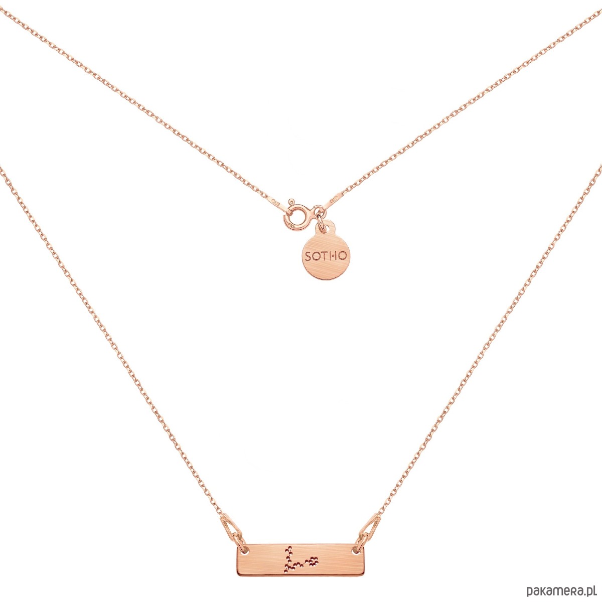 Złoty matowy naszyjnik łańcuszkowy zdobiony konstelacją zodiakalną Ryb i zawieszką z logo marki. Całość wykonana ze srebra 925 powlekanego 18 karatowym różowym złotem.