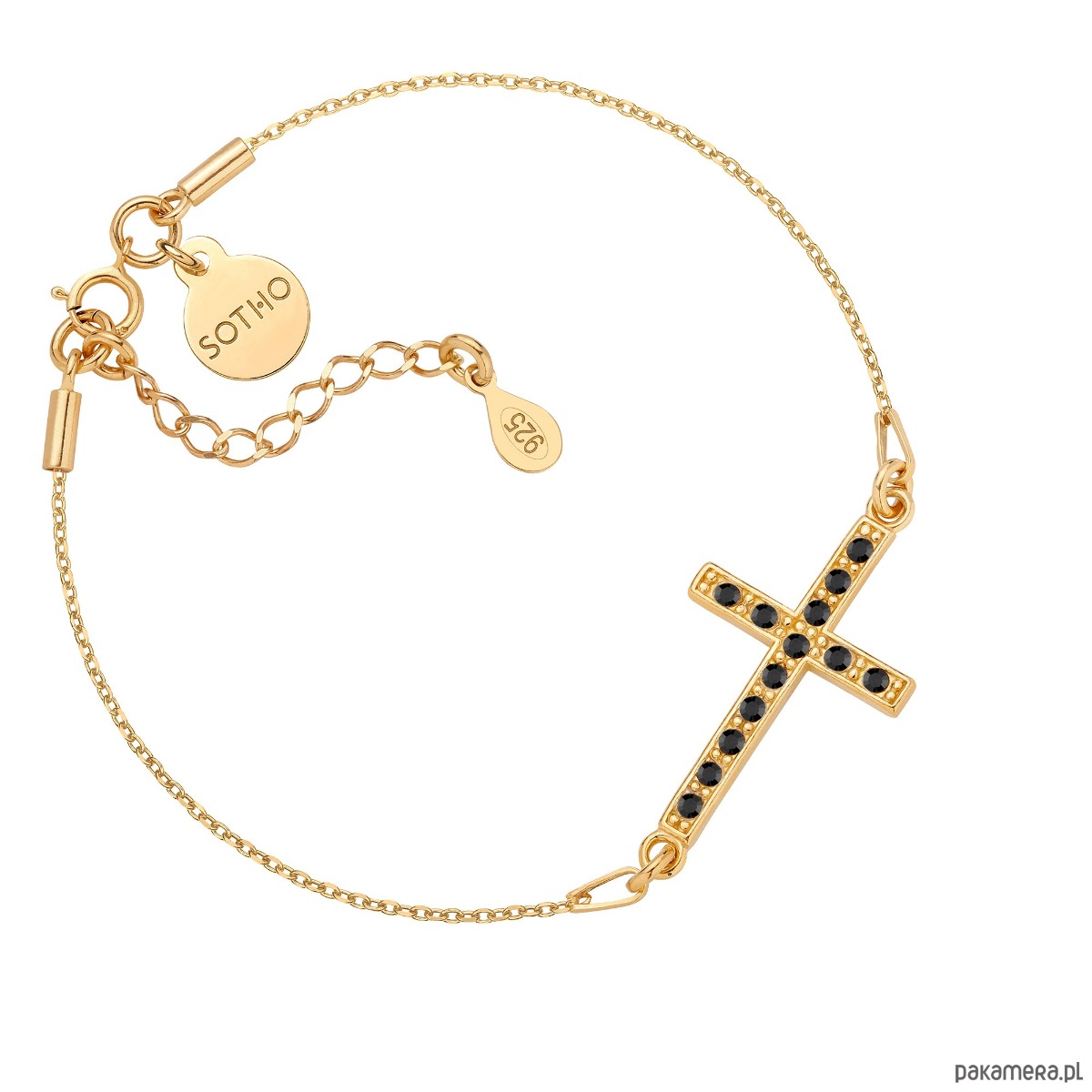 Złota bransoletka łańcuszkowa zdobiona krzyżem wysadzanym czarnymi kryształami SWAROVSKI® CRYSTAL w kolorze Jet i zawieszką z logo marki. Całość wykonana ze srebra 925 powlekanego 24 karatowym żółtym złotem.