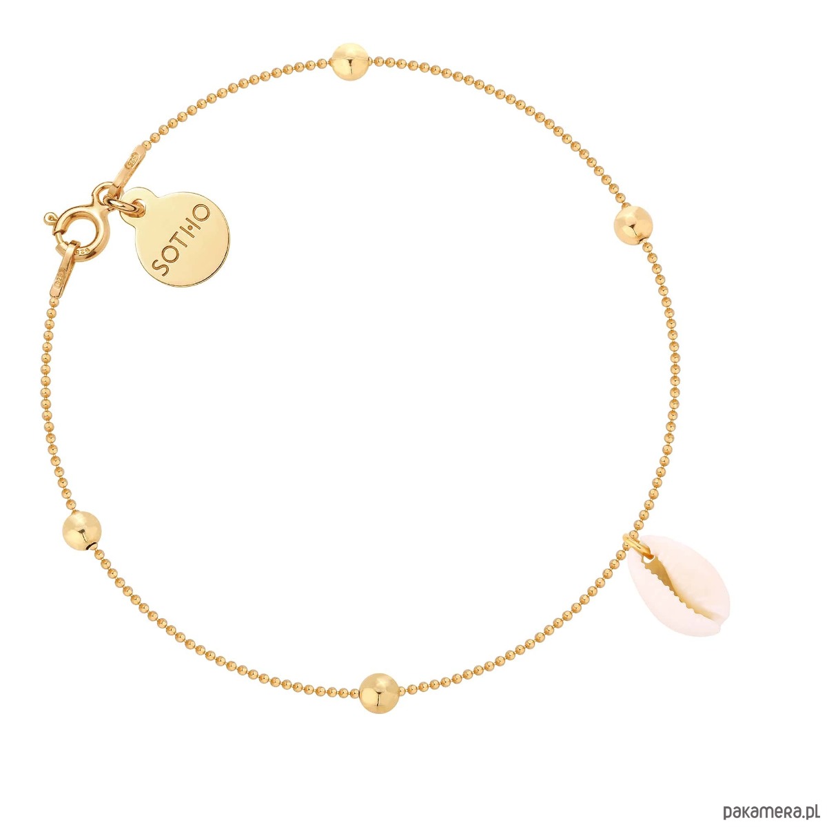 Złota bransoletka z kuleczkami i muszelką oraz zawieszką z logo marki. Całość wykonana ze srebra 925 powlekanego 24 karatowym żółtym złotem.