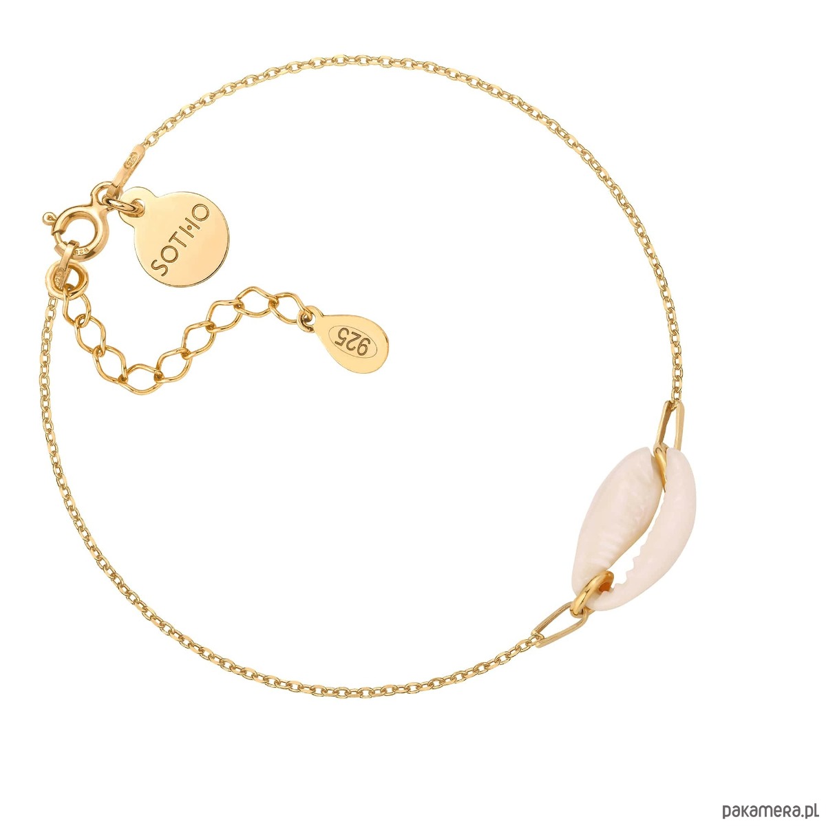 Złota bransoletka łańcuszkowa z muszelką i zawieszką z logo marki. Każdy egzemplarz posiada unikatową, niepowtarzalną muszelkę. Całość wykonana ze srebra 925 powlekanego 24 karatowym żółtym złotem.