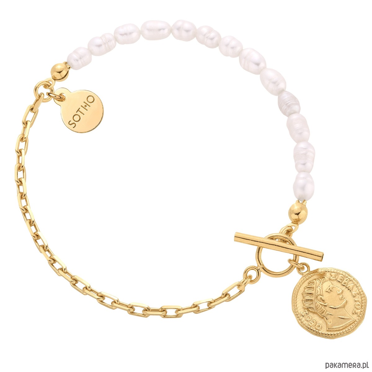 Złota bransoletka z naturalnych pereł zdobiona monetą, łańcuchem i zawieszką z logo marki. Całość wykonana ze srebra 925 pokrytego 24 karatowym żółtym złotem.