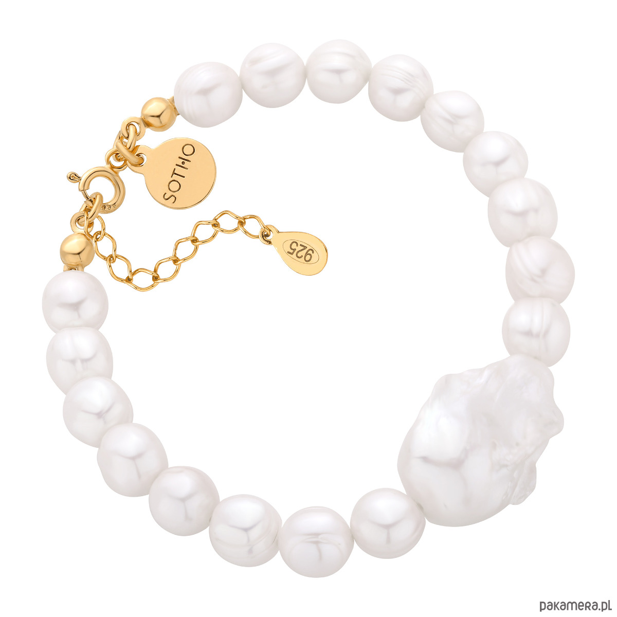 Złota bransoletka wykonana z naturalnych pereł słodkowodnych z barokową perłą oraz zawieszką z logo marki. Wszystkie elementy wykonane ze srebra 925 powlekanego 24 karatowym żółtym złotem.