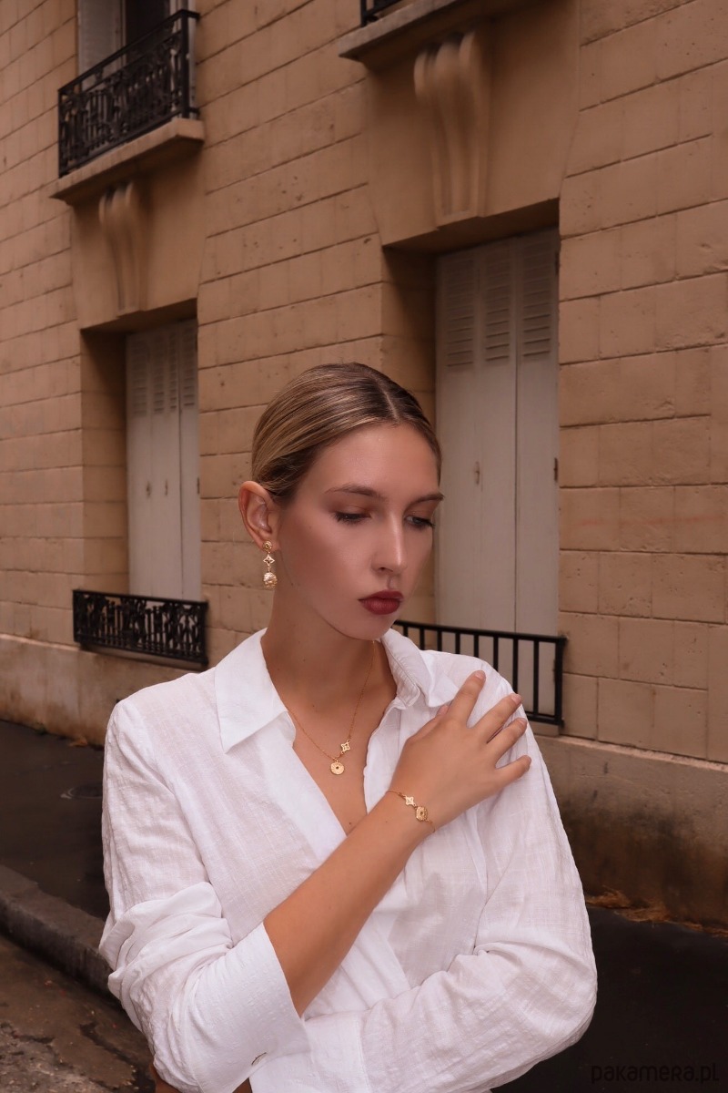Złota bransoletka łańcuszkowa zdobiona z rozetką i medalionem i zawieszką z logo marki. Całość wykonana ze srebra 925 powlekanego 24 karatowym żółtym złotem.