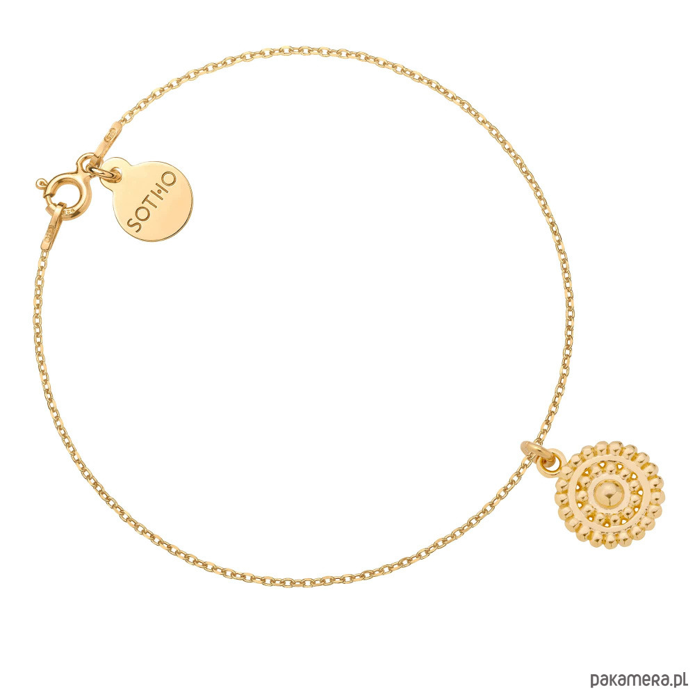 Złota bransoletka łańcuszkowa zdobiona rozetką i zawieszką z logo marki. Całość wykonana ze srebra 925 powlekanego 24 karatowym żółtym złotem.
