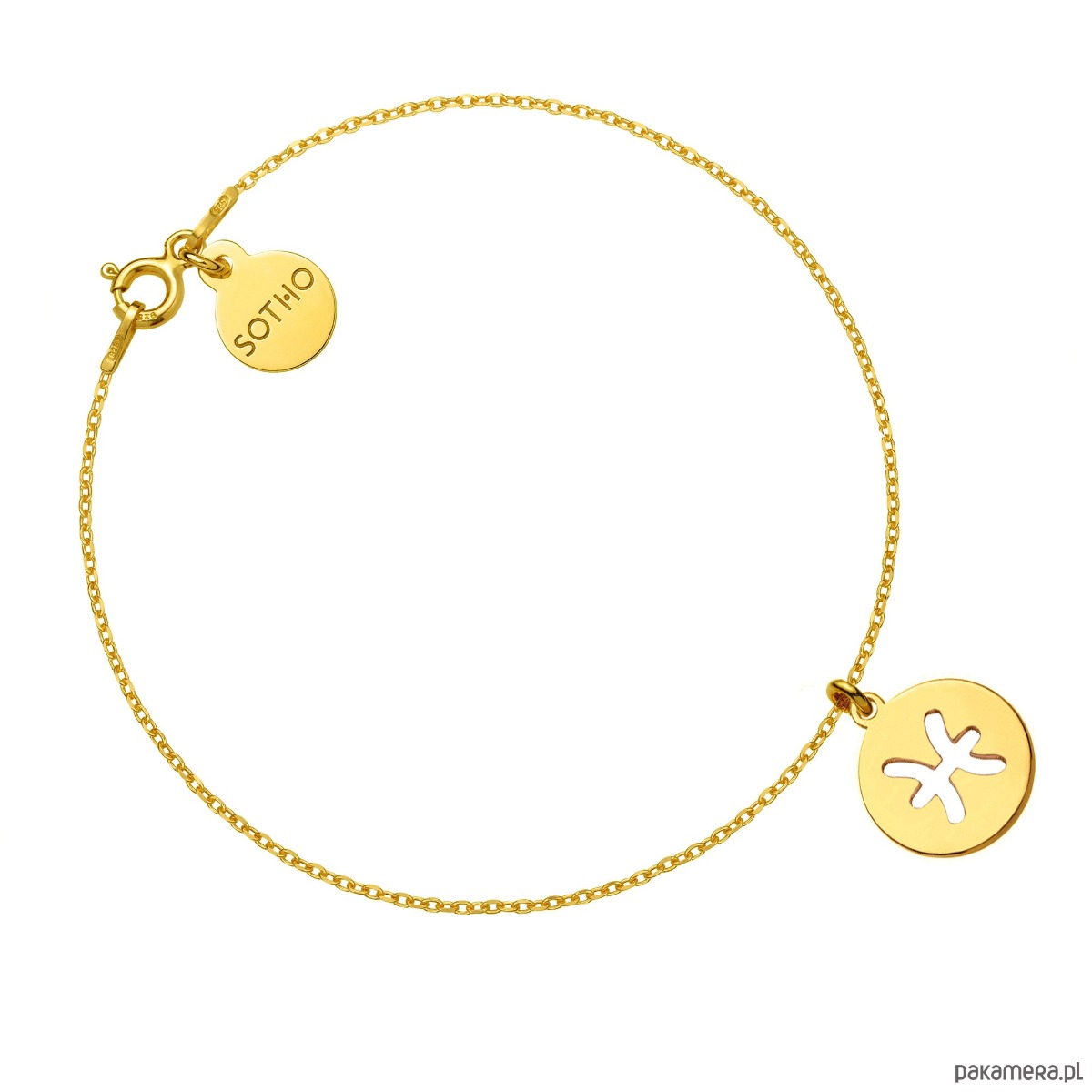 Złota bransoletka łańcuszkowa zdobiona znakiem zodiaku Ryb i zawieszką z logo marki. Całość wykonana ze srebra 925 powlekanego 24 karatowym żółtym złotem.