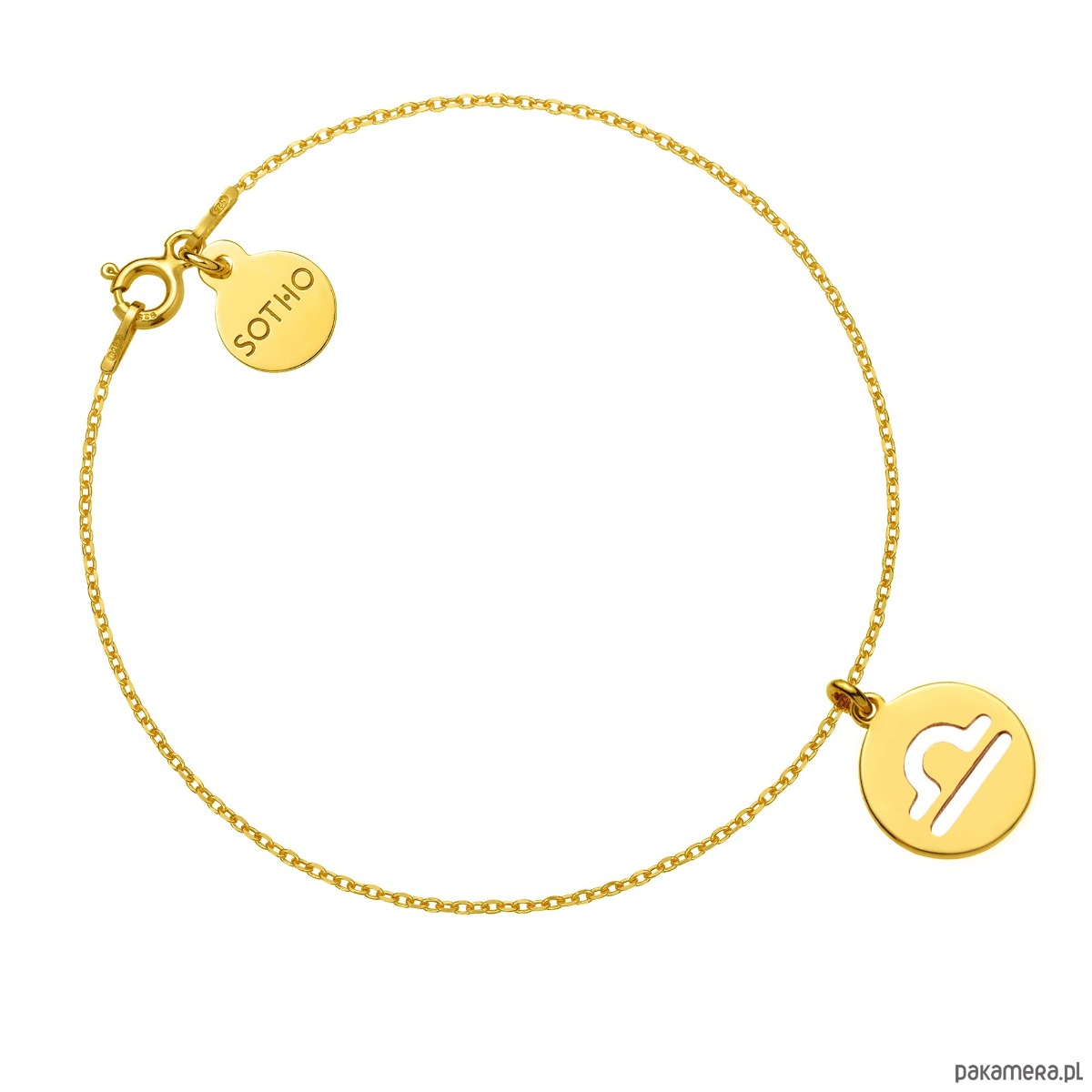 Złota bransoletka łańcuszkowa zdobiona znakiem zodiaku Wagi i zawieszką z logo marki. Całość wykonana ze srebra 925 powlekanego 24 karatowym żółtym złotem.