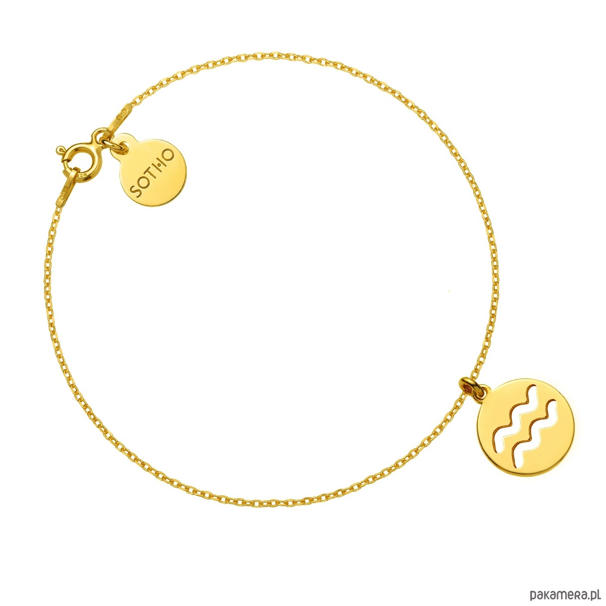 Złota bransoletka łańcuszkowa zdobiona znakiem zodiaku Wodnika i zawieszką z logo marki. Całość wykonana ze srebra 925 powlekanego 24 karatowym żółtym złotem.