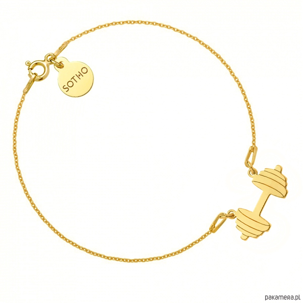 Złota bransoletka łańcuszkowa zdobiona sztangą i zawieszką z logo marki. Całość wykonana ze srebra 925 powlekanego 24 karatowym żółtym złotem.