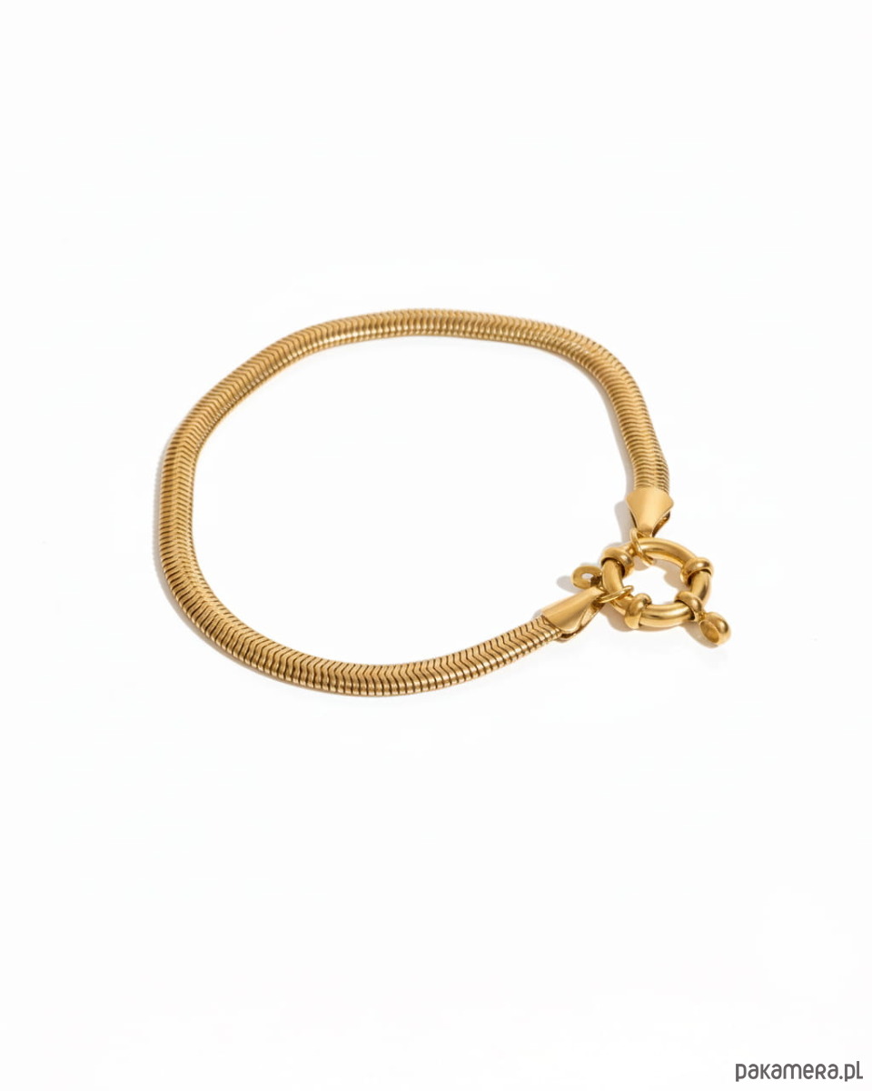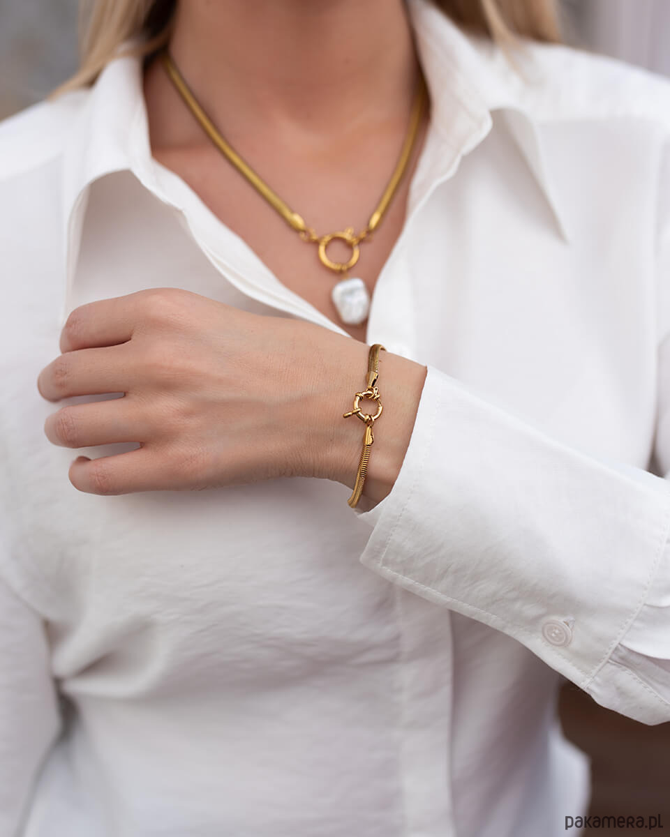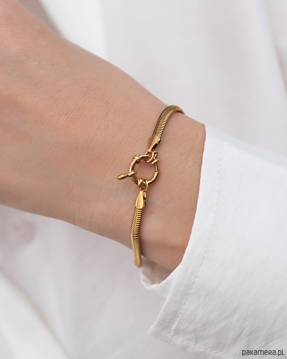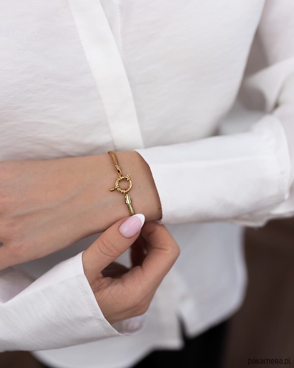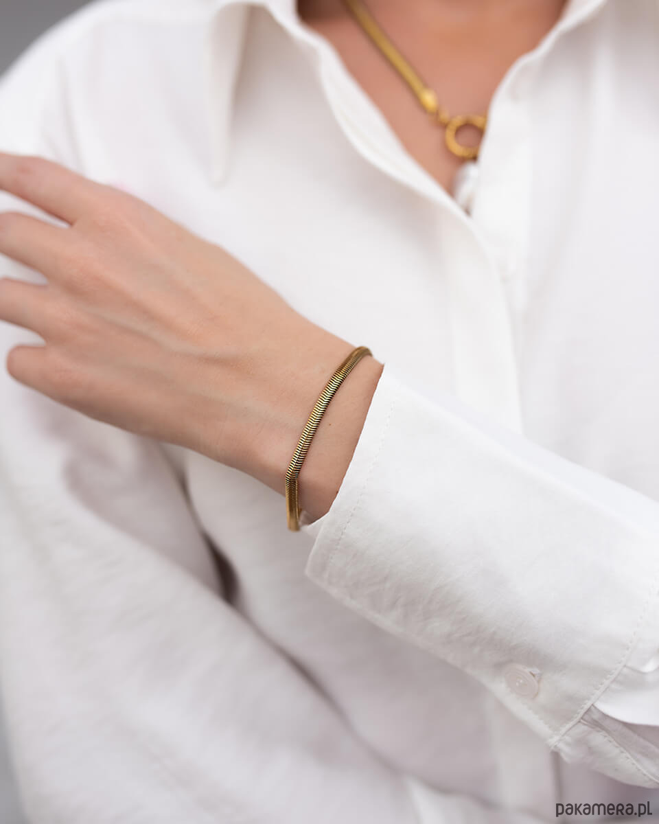 Szukasz dodatku, który jest jednocześnie subtelny i wyjątkowy? Ta złota bransoletka żmijka to must-have każdej kobiety, która ceni nowoczesny styl z nutą klasyki. Jej forma idealnie dopasowuje się do nadgarstka i delikatnie błyszczy przy każdym ruchu, dzięki czemu przyciąga spojrzenia, ale bez przesady.Zapięcie jest bardzo wygodne w użytkowaniu. Nosząc tę bransoletkę zapomnisz, że masz coś na ręce aż do chwili, gdy ktoś zapyta: „Skąd masz tę bransoletkę?”Pasuje do wszystkiego - klasycznej koszuli, swetra, białego t-shirtu czy sukienki. To idealny dodatek do stylizacji minimalistycznych, ale też świetna baza do budowania warstw z innymi bransoletkami.Wymiary:Długość: 18,5 cmZapięcie: 1,8 cmMateriał: stal chirurgiczna