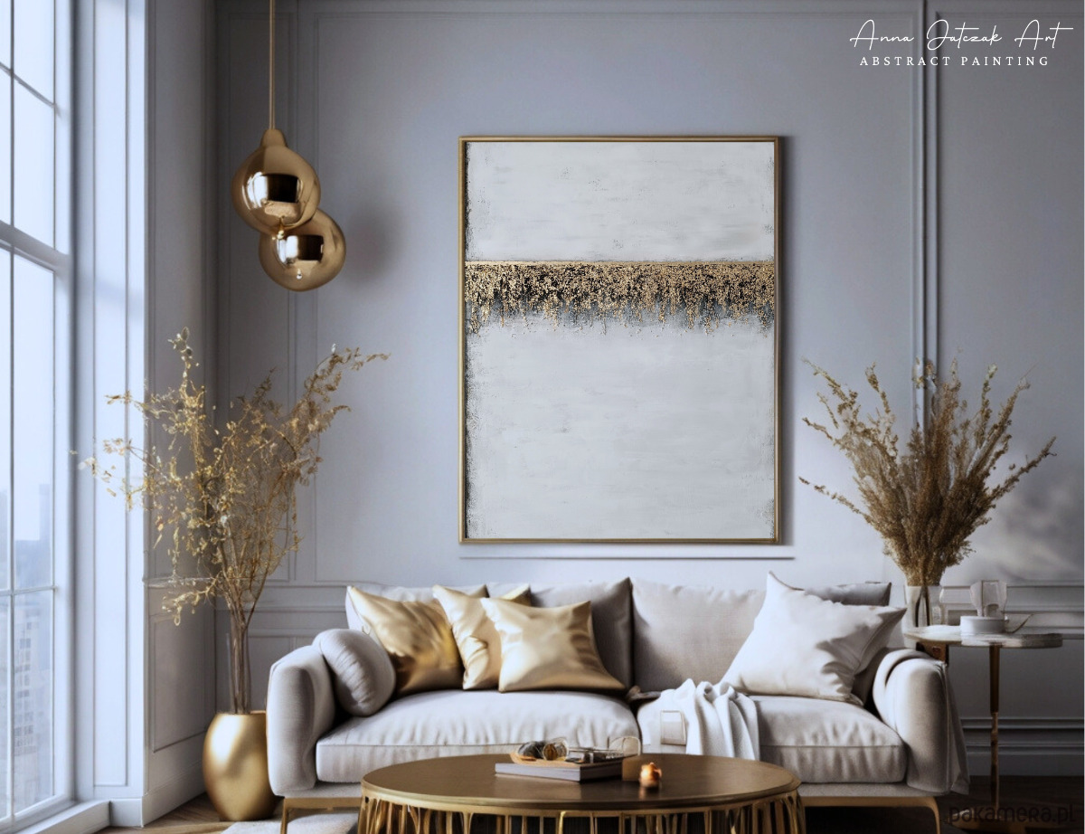 Dodaj elegancji swojemu wnętrzu dzięki obrazowi „Złota granica”. To nowoczesne dzieło sztuki łączy minimalistyczne tło w delikatnych odcieniach bieli i szarości z efektownym, teksturalnym akcentem ze złotych płatków. Obraz został ręcznie wykonany z dbałością o każdy detal, dzięki czemu każdy egzemplarz jest unikatowy.