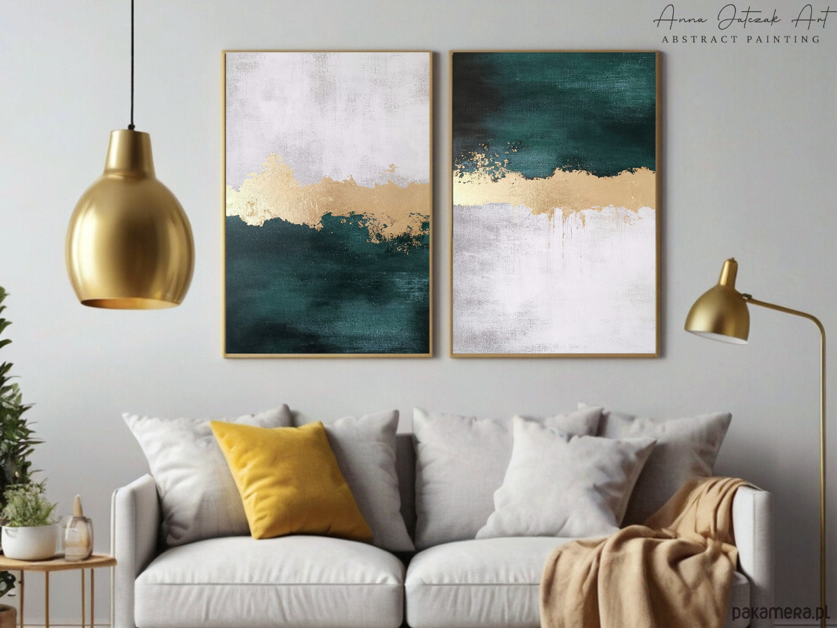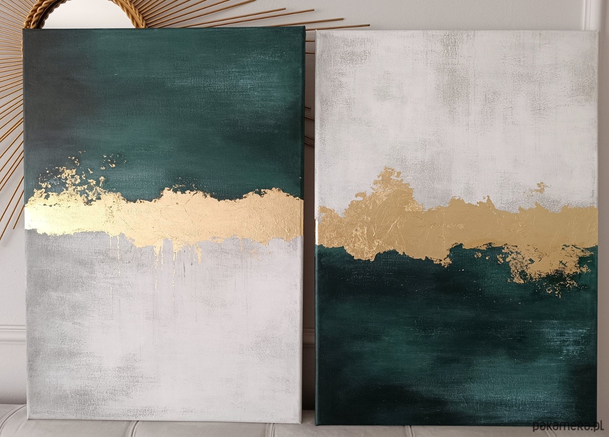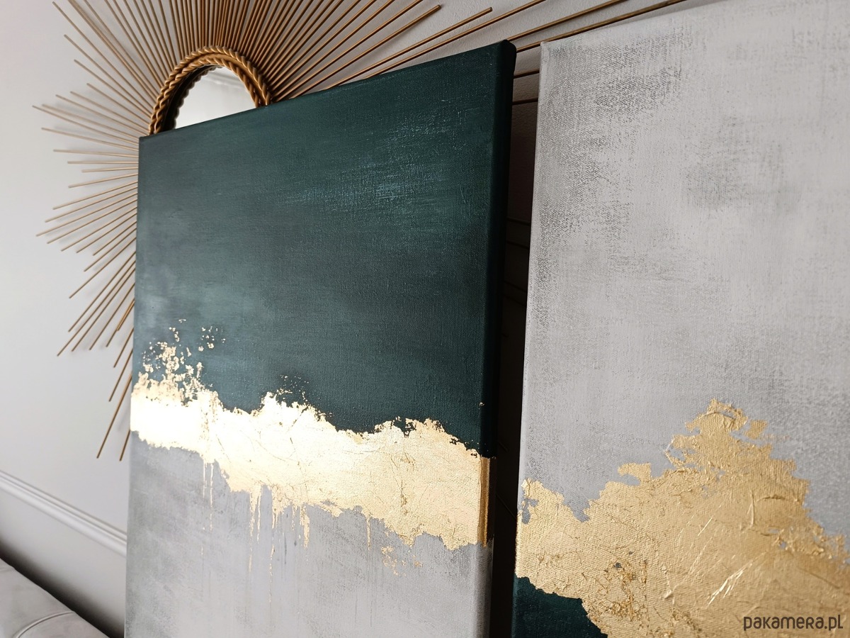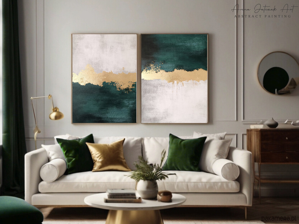 Oryginalny zestaw dwóch obrazów akrylowych (dyptyk), które idealnie się uzupełniają i mogą być zawieszone obok siebie lub osobno. Kompozycja łączy głębokie odcienie zieleni ze złotymi akcentami szlagmetalu oraz subtelnym beżem, tworząc elegancki i ponadczasowy efekt.
