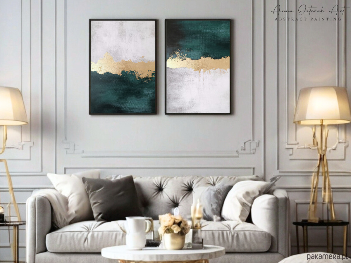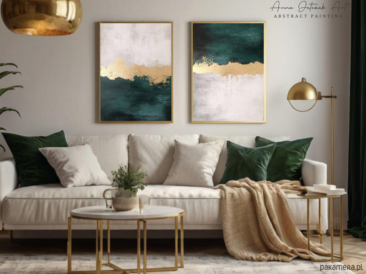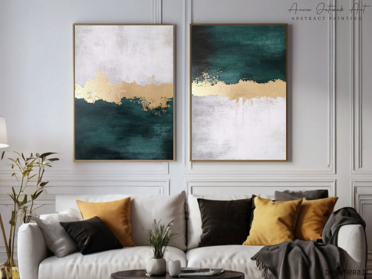 Oryginalny zestaw dwóch obrazów akrylowych (dyptyk), które idealnie się uzupełniają i mogą być zawieszone obok siebie lub osobno. Kompozycja łączy głębokie odcienie zieleni ze złotymi akcentami szlagmetalu oraz subtelnym beżem, tworząc elegancki i ponadczasowy efekt.