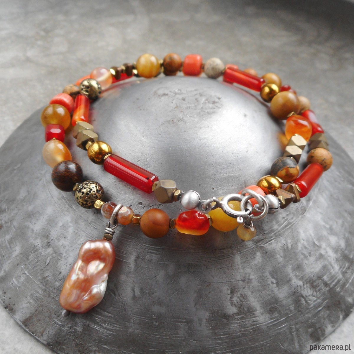 Naszyjnik wykonany ze szlachetnego srebra i kamieni naturalnych; klasyczny, nasycony barwami złotej jesieni, różnorodny w kształtach i kolorach minerałów, bardzo kobiecy.