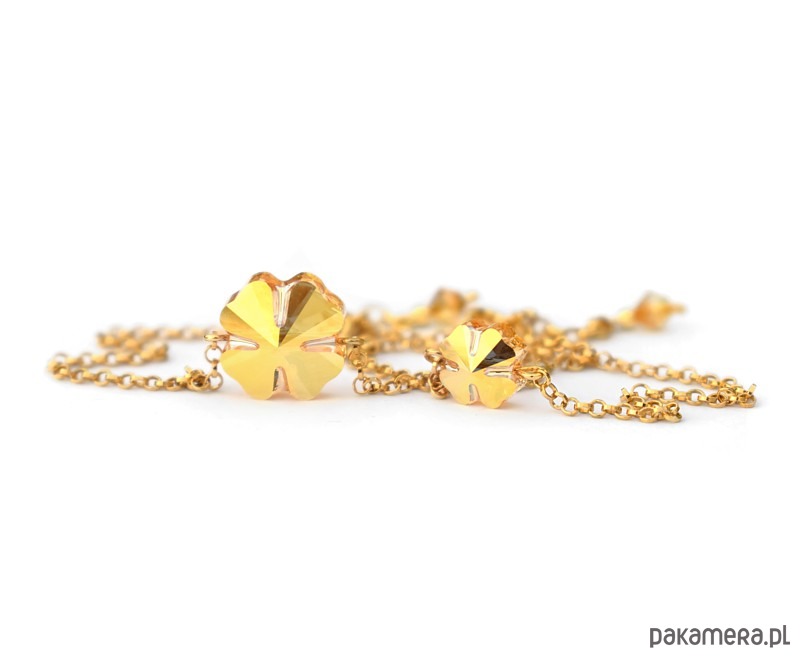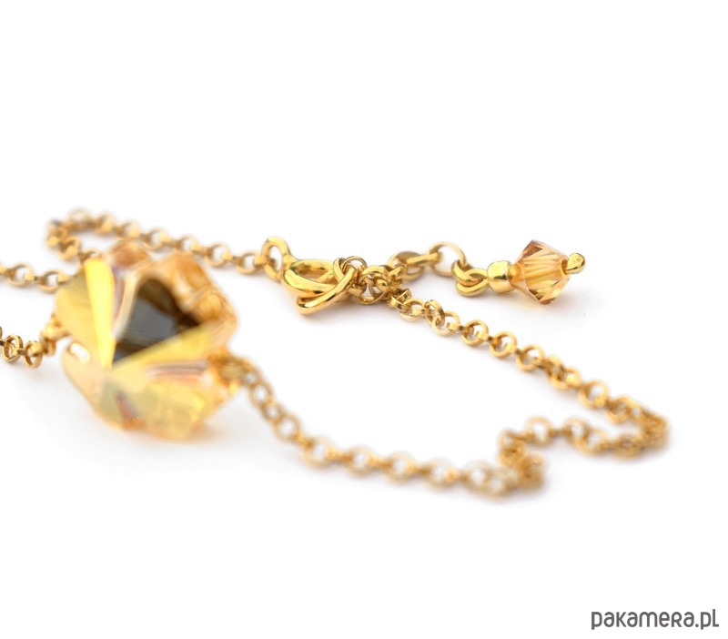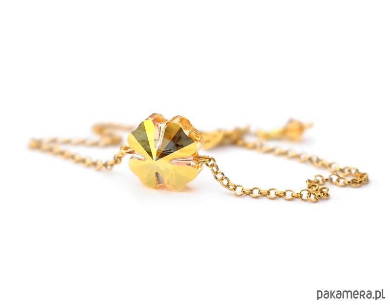 Wykonałam ją na bazie cienkiego, pokrytego warstwą 24-karatowego złota srebrnego łańcuszka (próba 925) o okrągłych ogniwkach, w jego środek wplatając większą, 12-milimetrową koniczynkę z kryształu Swarovski w odcieniu Metallic Sunshine, czyli najzłotszym złocie 🙂