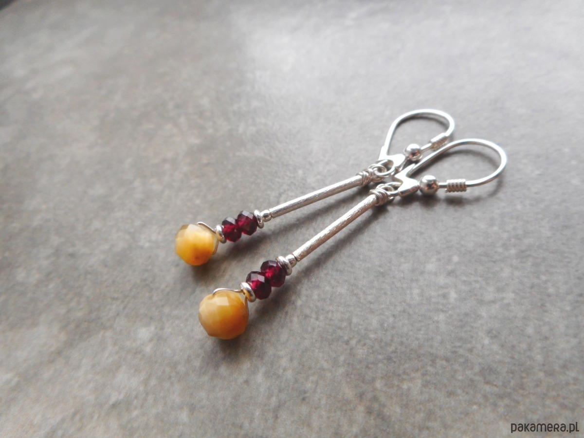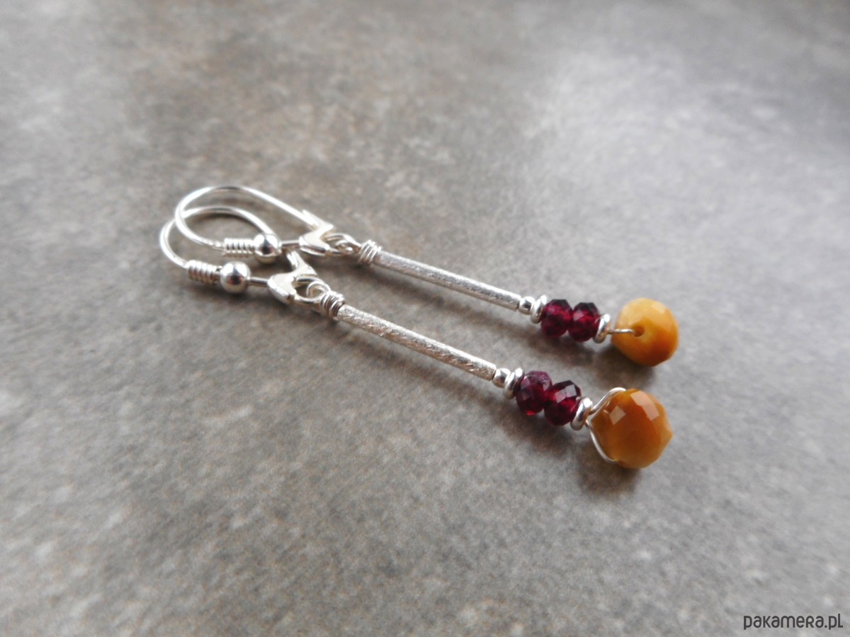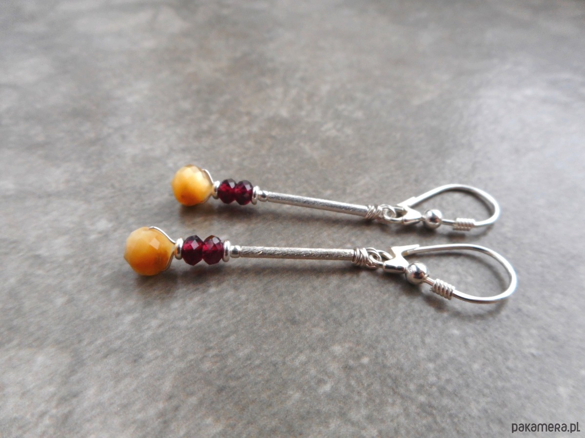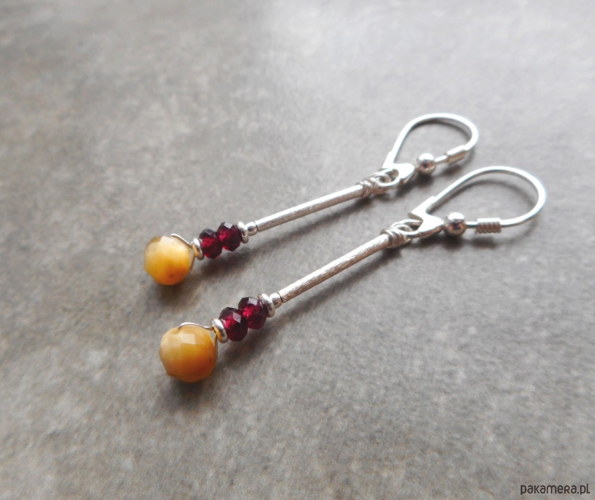 Smukłe kolczyki z kamieni naturalnych i szlachetnego srebra; wygodne, eleganckie, połączenie srebra i minerałów, w tym tygrysiego oka - pięknego kamienia połyskującego złoto-miodowymi pasmami; tygrysie oko uważane jest za minerał dodający energii .