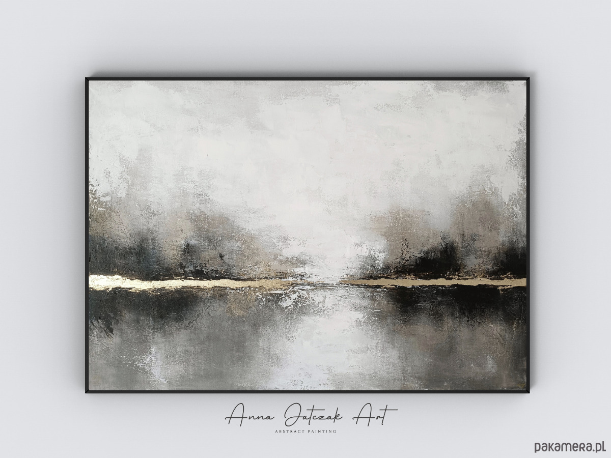 "Złota Linia Ciszy" ręcznie malowany obraz abstrakcyjny . Dominują w nim odcienie bieli, szarości, beżu i czerni przełamane subtelną, złotą linią, która nadaje całości wyjątkowej elegancji i głębi.