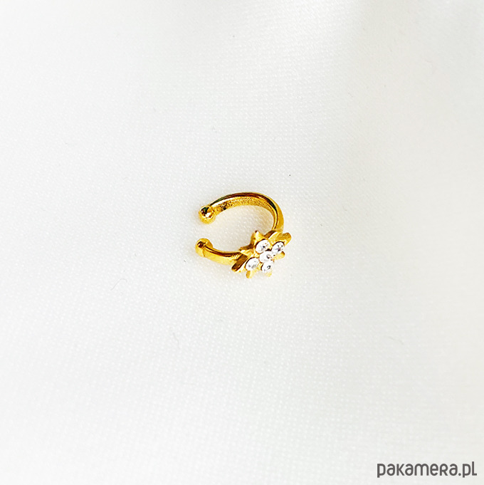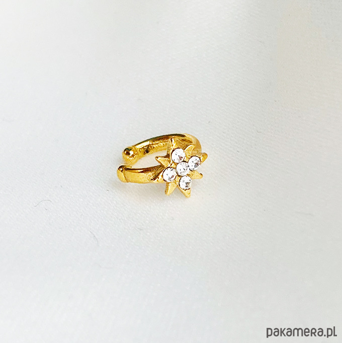 Piękna złocona nausznica z małą gwiazdką wysadzana cyrkoniami, kolczyk bez konieczności przekłuwania uszu. Można nosić na całej długości ucha. Delikatnie można dopasować wielkość kolczyka.