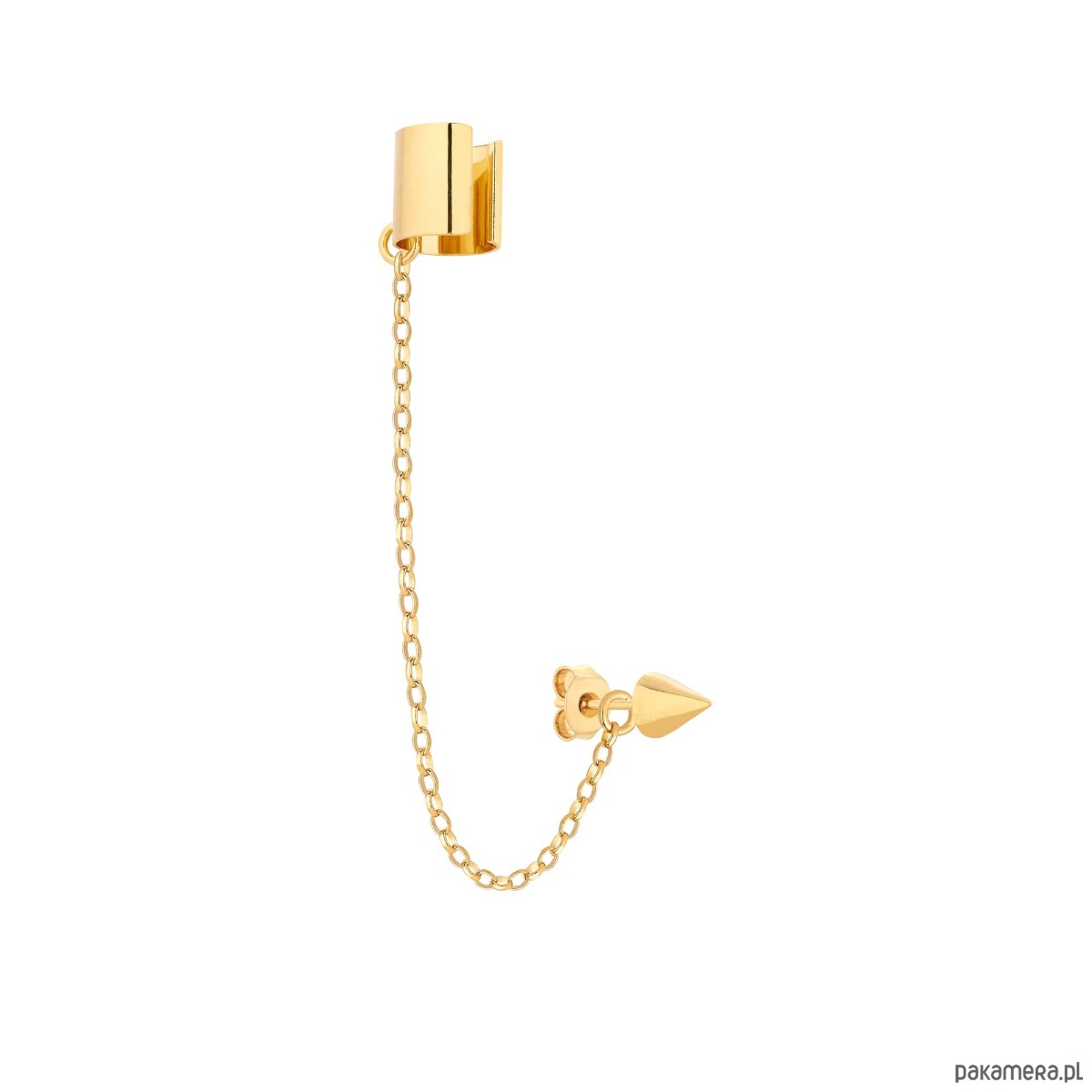 Złota gruba nausznica z łańcuszkiem i ćwiekiem w całości wykonana ze srebra 925 powlekanego 24 karatowym żółtym złotem.