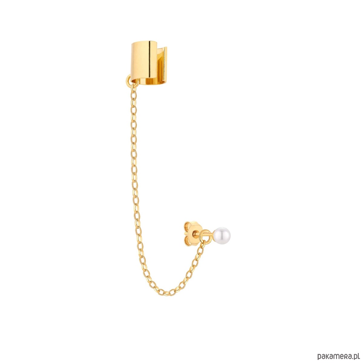 Złota gruba nausznica z łańcuszkiem i perłą SWAROVSKI® CRYSTAL w kolorze White, wykonana ze srebra 925 powlekanego 24 karatowym żółtym złotem.