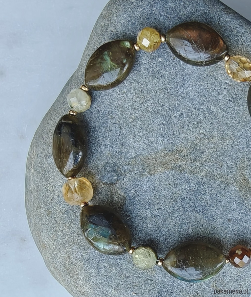 Ciekawa i nieoczywista bransoletka wykonana z ciemnego labradorytu z odblaskami, rozświetlonego cytrynami oraz kianitem. Podczas ruchu dłoni bransoletka ukazuje swoje walory w postaci niebieskich, zielonkawych i złotych rozbłysków. Bransoletka jest urocza w każdą pogodę i o każdej porze roku. Labradoryt pokazuje swoją moc w średnim świetle, zaś kianit i cytryn lśnią w słońcu i widnych pomieszczeniach. Szczególnie ciekawy jest kianit w odcieniach rudego i zieleni, z bogatym wnętrzem.