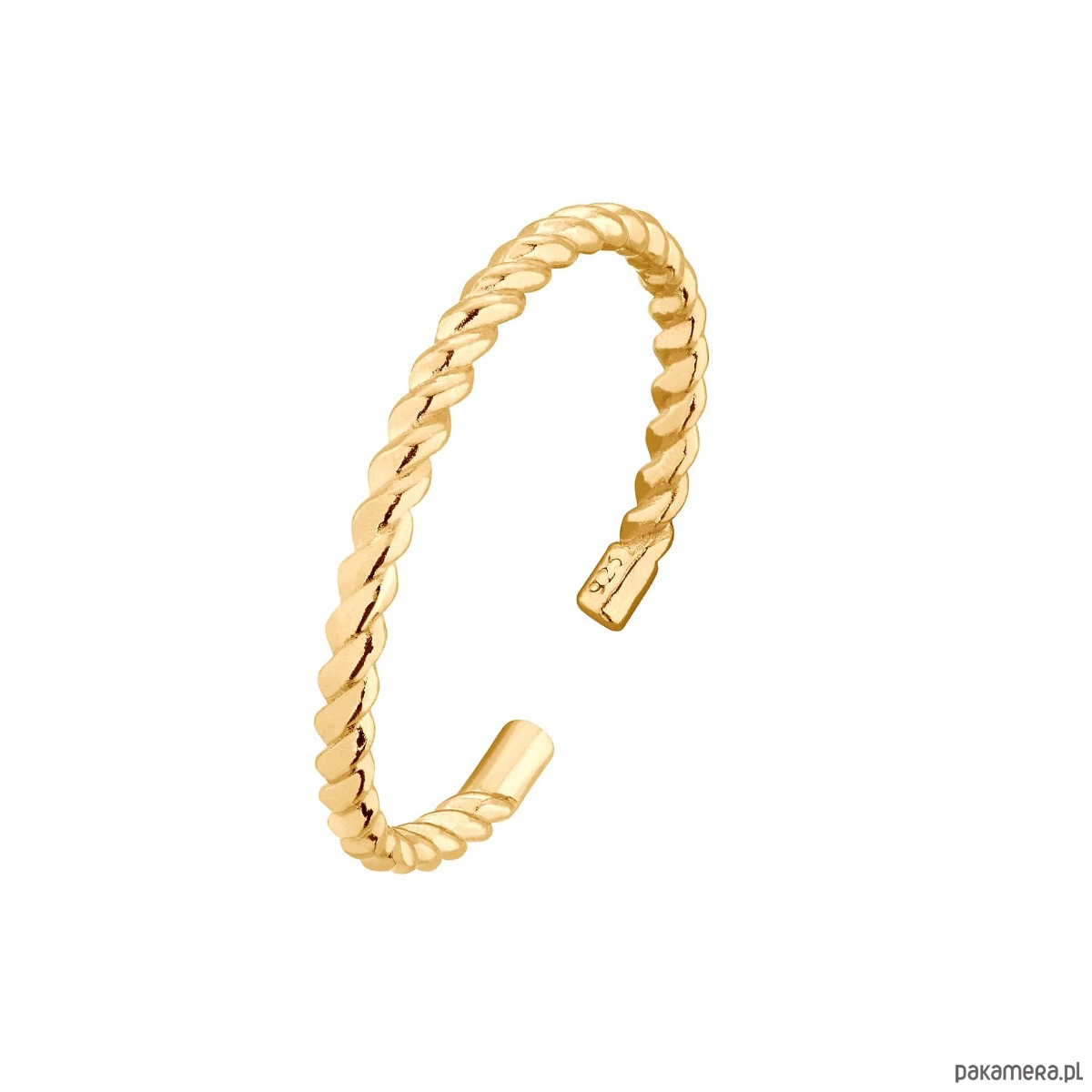 Złota skręcana obrączka. Całość wykonana ze srebra 925 powlekanego 24 karatowym żółtym złotem.