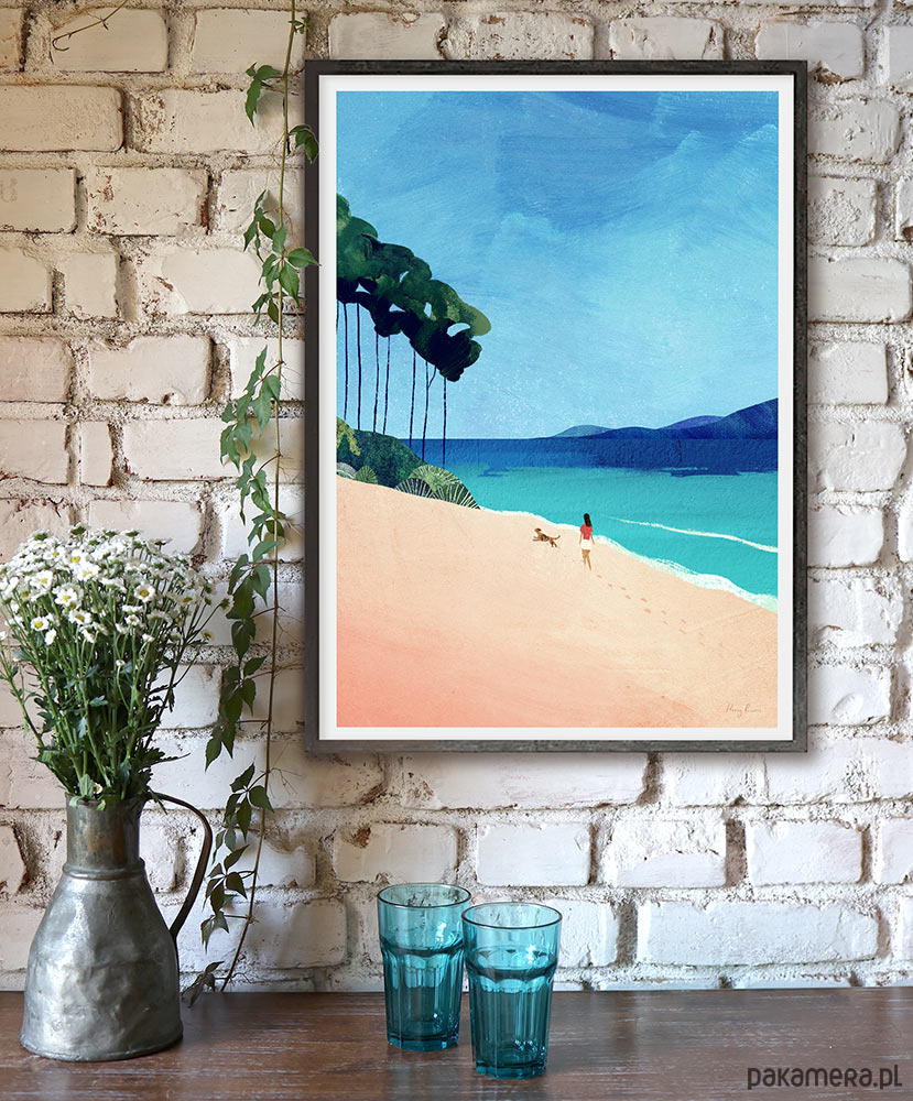 Plakat przenosi nas w sam środek słonecznego dnia. Brzegiem oceanu, po miękkim piasku spaceruje dziewczyna ze swoim psem. Lazurowe niebo odcina się ciepłą barwą od turkusu wody. Plakat "Złota plaża - spacer nad oceanem", to pochwała drobnych przyjemności, które stanowią najlepszy moment dnia.