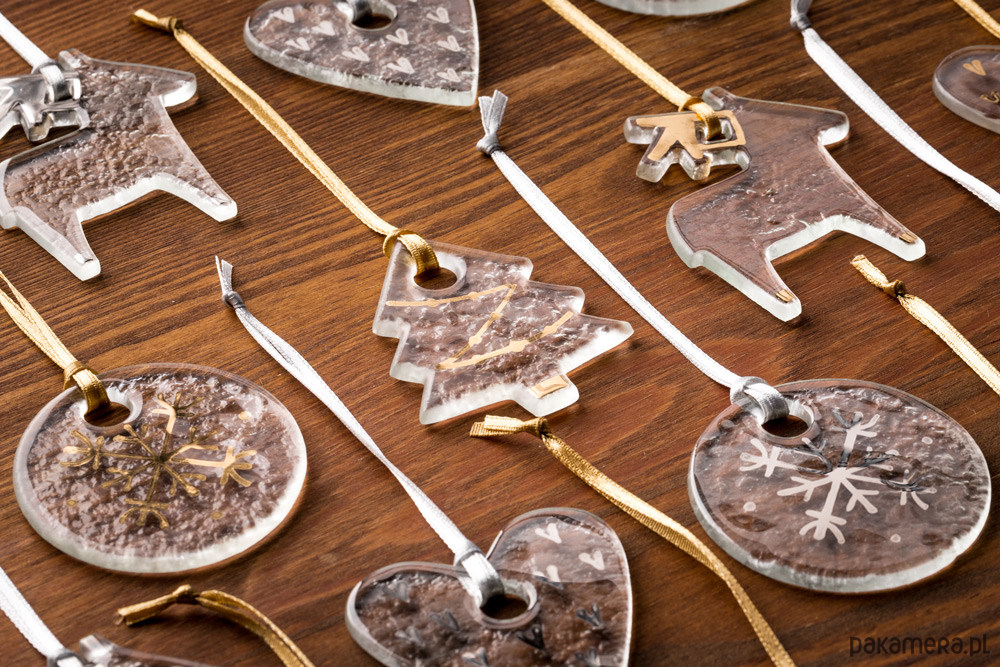 Autorska świąteczna zawieszka na choinkę wykonana ze szkła metodą fusingu. Ozdoba wykonana ze szkła bezbarwnego, malowana ręcznie prawdziwym złotem. Spód szkła posiada delikatną fakturę ciekawie odbijającą światło.