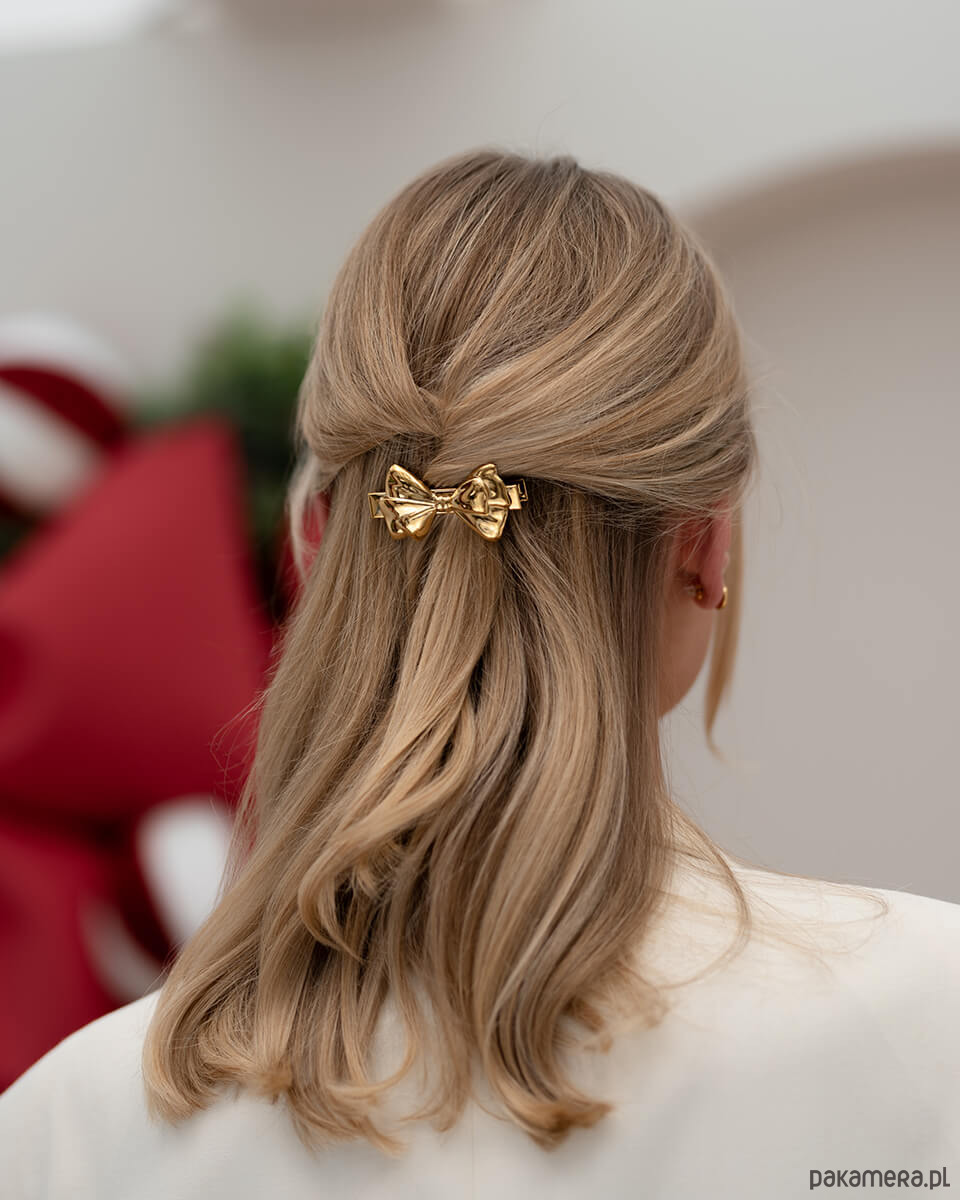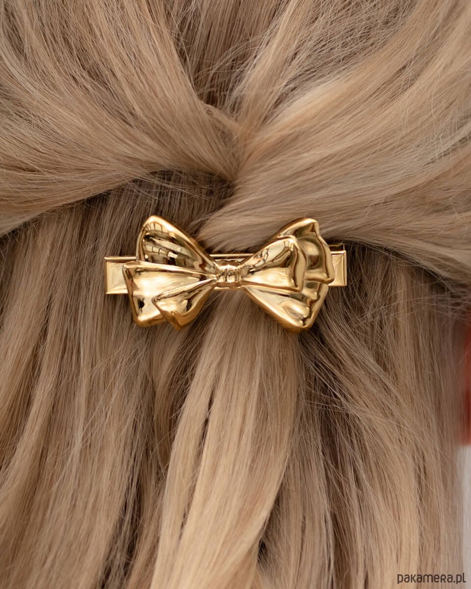 Złota spinka do włosów z kokardą – elegancki i funkcjonalny dodatek, który w mgnieniu oka urozmaici Twoją fryzurę. Wykonana jest z trwałej stali chirurgicznej i pokryta 18-karatowym złotem. Jej subtelny design w kształcie kokardy doda Twojej stylizacji wyjątkowego uroku.Szukasz oryginalnej ozdoby do włosów? Ta spinka jest doskonałym rozwiązaniem! Stal chirurgiczna gwarantuje, że spinka nie ciemnieje ani nie traci blasku z biegiem czasu. Masz dość biżuterii, która szybko się niszczy? Ta spinka jest odporna na zarysowania i codzienne użytkowanie, dzięki czemu możesz cieszyć się jej pięknem przez długi czas.Zastanawiasz się, czy jest bezpieczna dla wrażliwej skóry? Stal chirurgiczna jest hipoalergiczna, więc nie musisz się martwić o podrażnienia. Spinka jest lekka i wygodna, idealna do noszenia przez cały dzień, niezależnie od okazji – świetnie sprawdzi się zarówno na co dzień, jak i podczas bardziej formalnych wyjść.Szukasz idealnego prezentu? Złota spinka do włosów z kokardą to doskonały pomysł na elegancki upominek, który z pewnością zachwyci każdą miłośniczkę stylowych dodatków.
