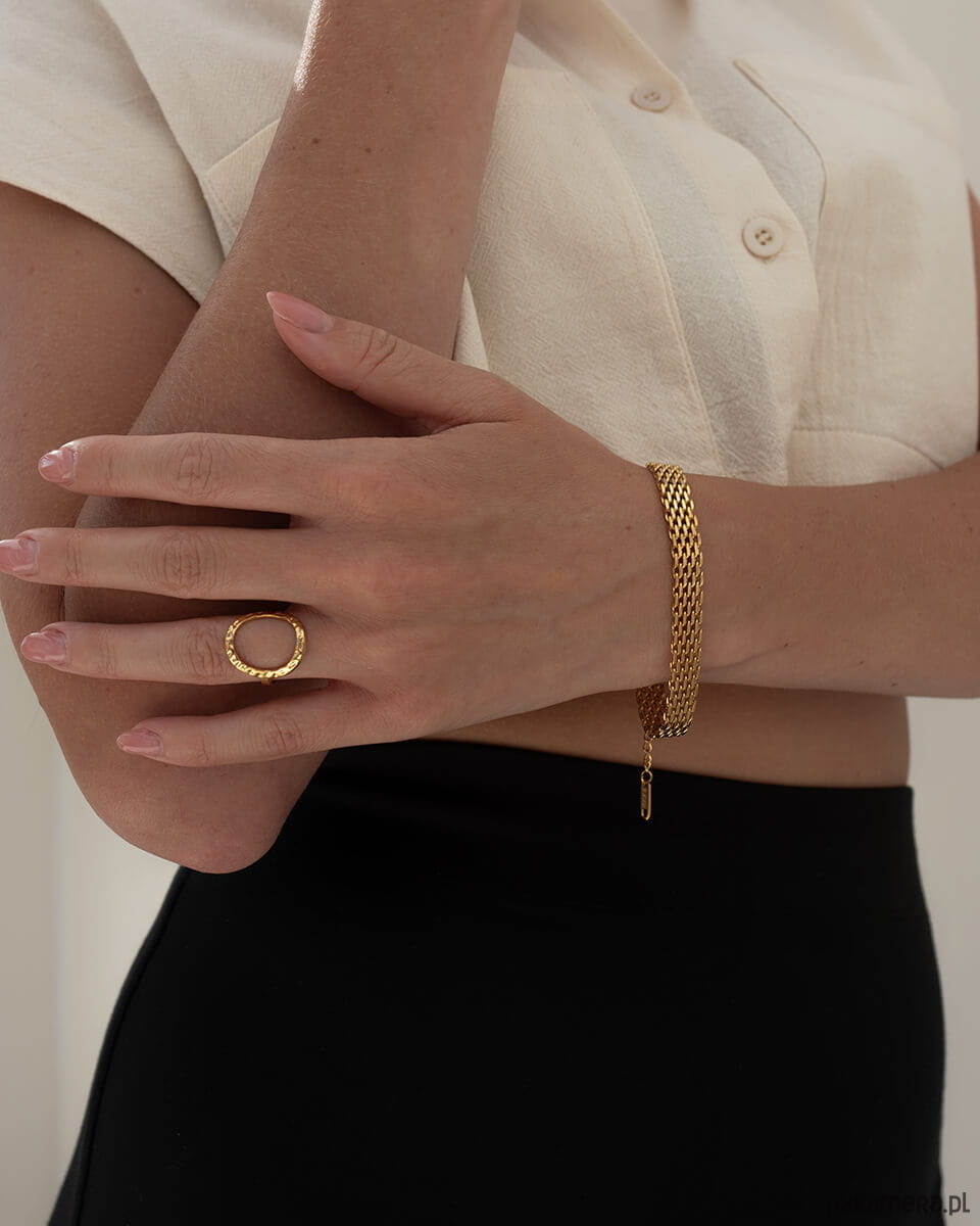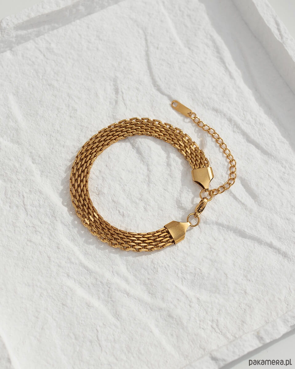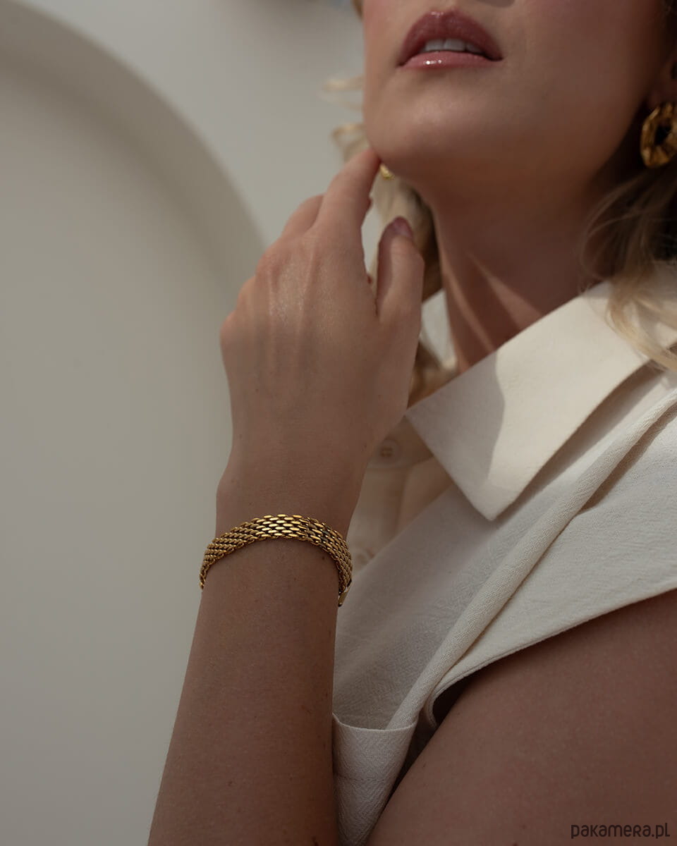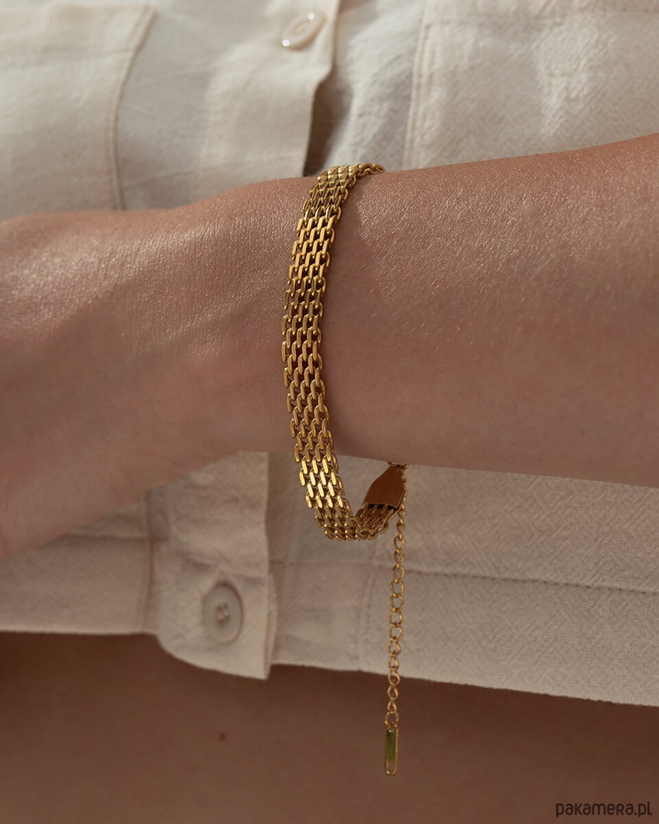 Zapinana konstrukcja bransoletki sprawia, że jest łatwa w zakładaniu i zdejmowaniu. Jej elegancki design i wykończenie 18-karatowym złotem dodają jej uroku i klasy. Nie ogranicza ruchów i możesz ją nosić przez cały dzień. Jej uniwersalny design sprawia, że doskonale komponuje się z różnymi stylizacjami, od casualowych po bardziej uroczyste. Dzięki temu, że jest to biżuteria ze stali chirurgicznej 316L nie musisz martwić się o reakcje alergiczne, czy podrażnienia skóry. Biżuteria to również świetny pomysł na prezent, w naszym sklepie znajdziesz eleganckie torebki prezentowe, które możesz dodać do zamówienia.