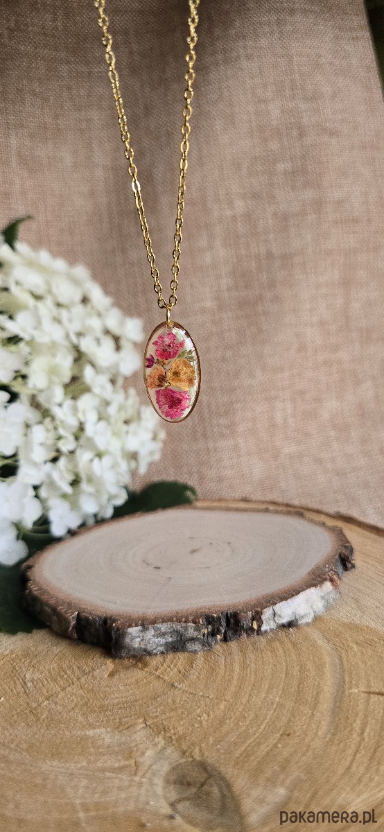 Oferuję Państwu unikalną biżuterię. Zawieszka jest wykonana z suszonych kwiatów i żywicy epoksydowej. Biżuteria jest wspaniałym i oryginalnym prezentem na lata.