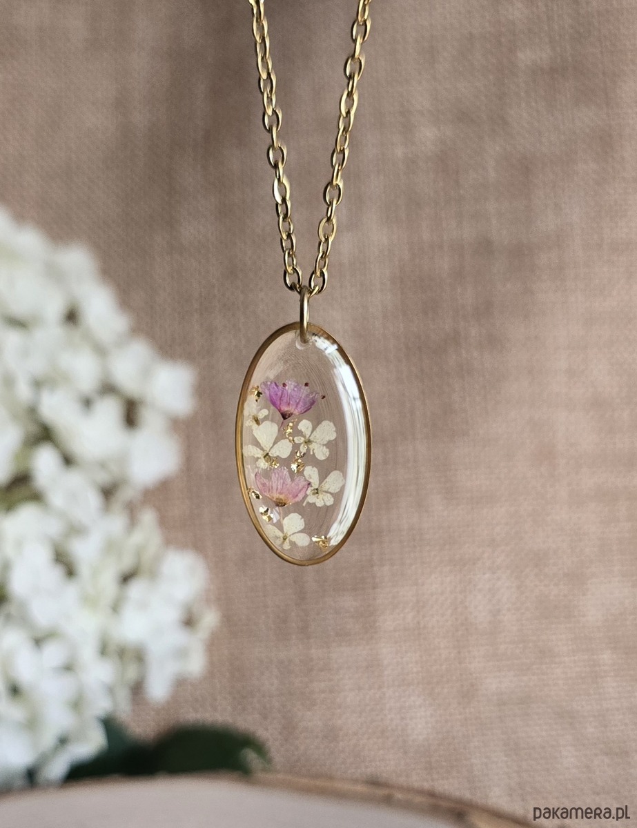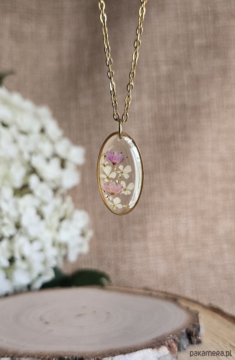 Oferuję Państwu unikalną biżuterię. Zawieszka jest wykonana z suszonych kwiatów i żywicy epoksydowej. Biżuteria jest wspaniałym i oryginalnym prezentem na lata.