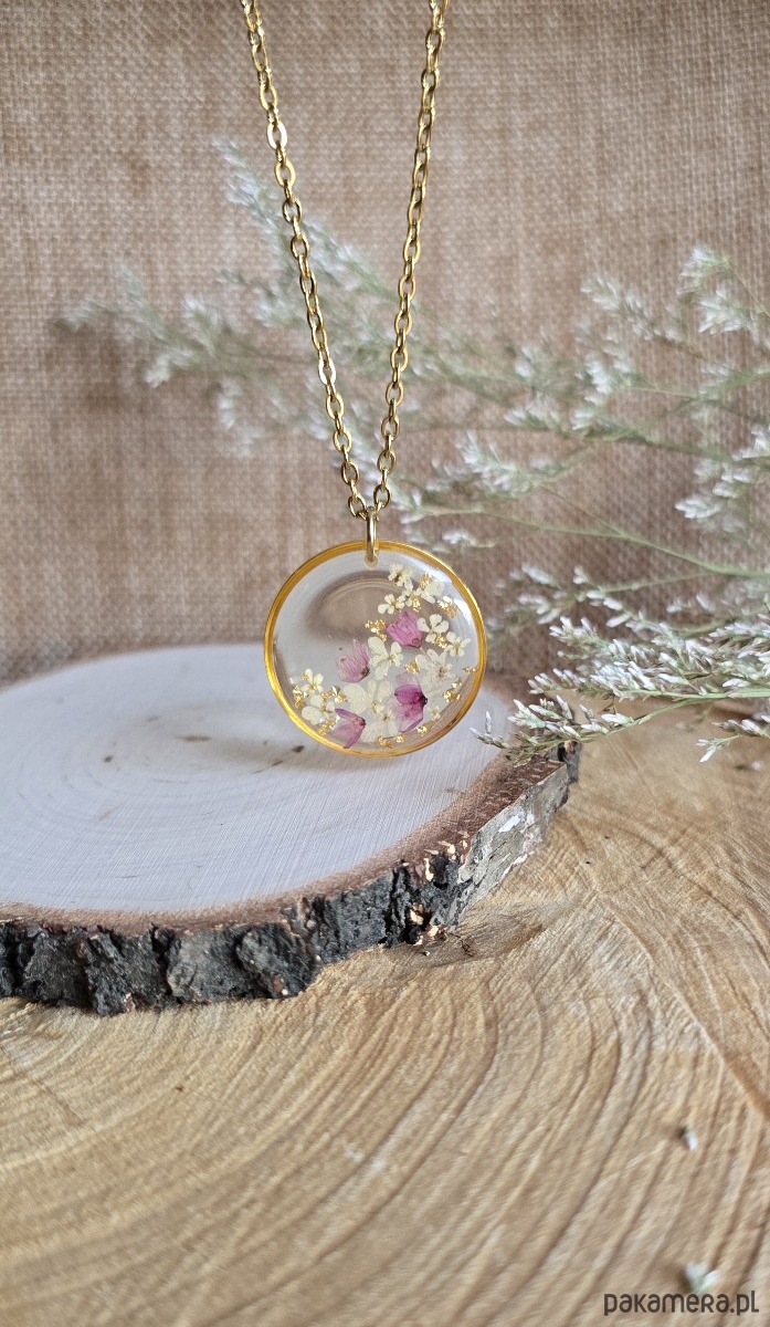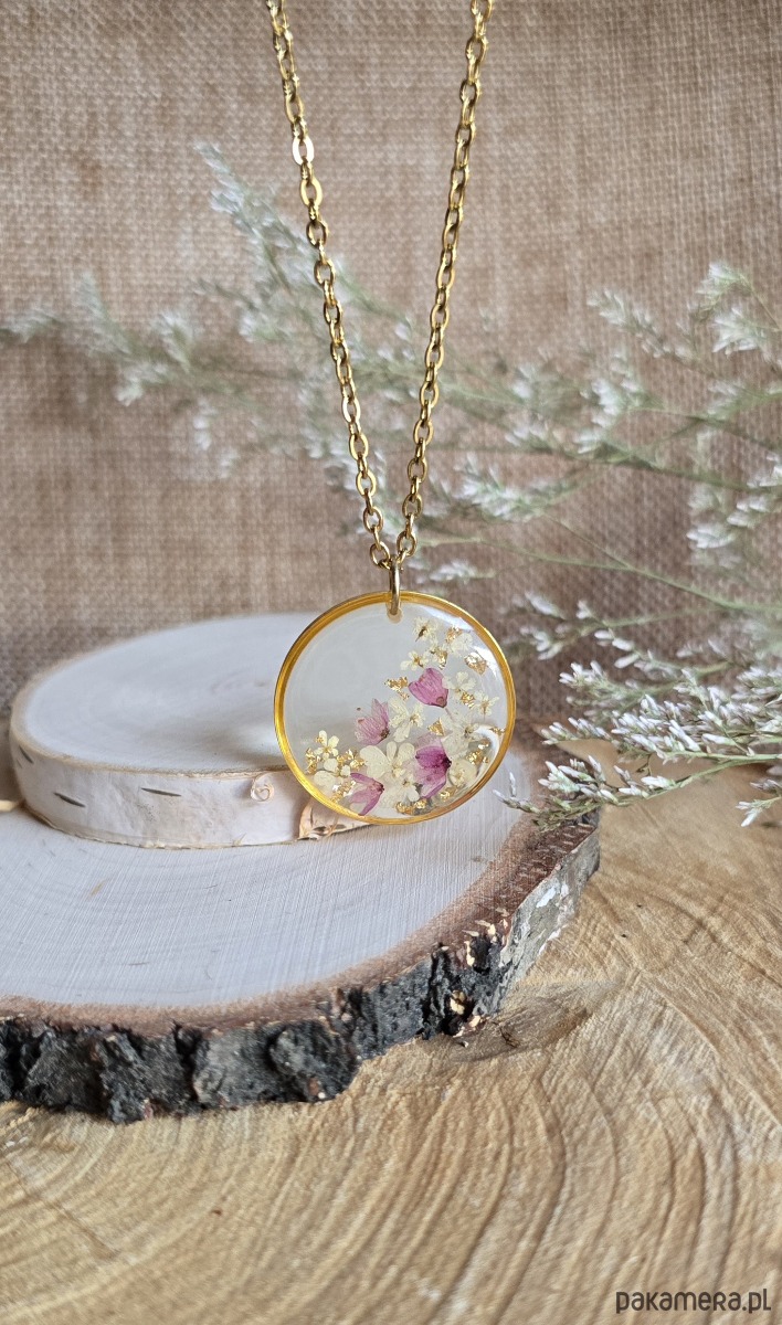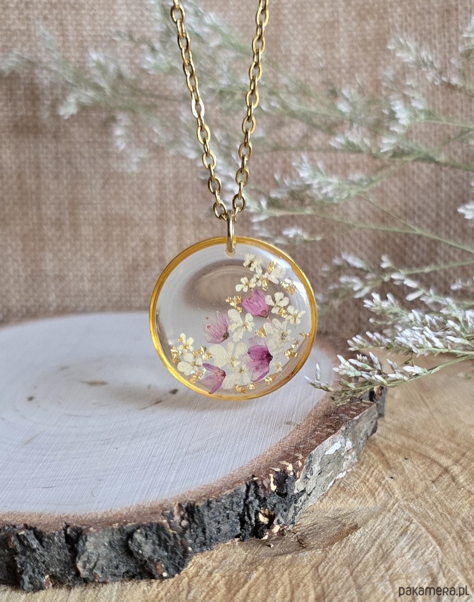 Oferuję Państwu unikalną biżuterię. Zawieszka jest wykonana z suszonych kwiatów i żywicy epoksydowej. Biżuteria jest wspaniałym i oryginalnym prezentem na lata.