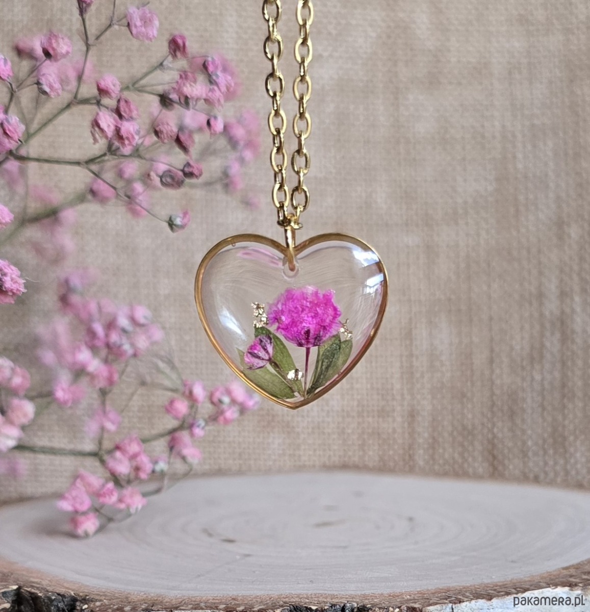 Oferuję Państwu unikalną biżuterię. Zawieszka jest wykonana z suszonych kwiatów i żywicy epoksydowej. Biżuteria jest wspaniałym i oryginalnym prezentem na lata.