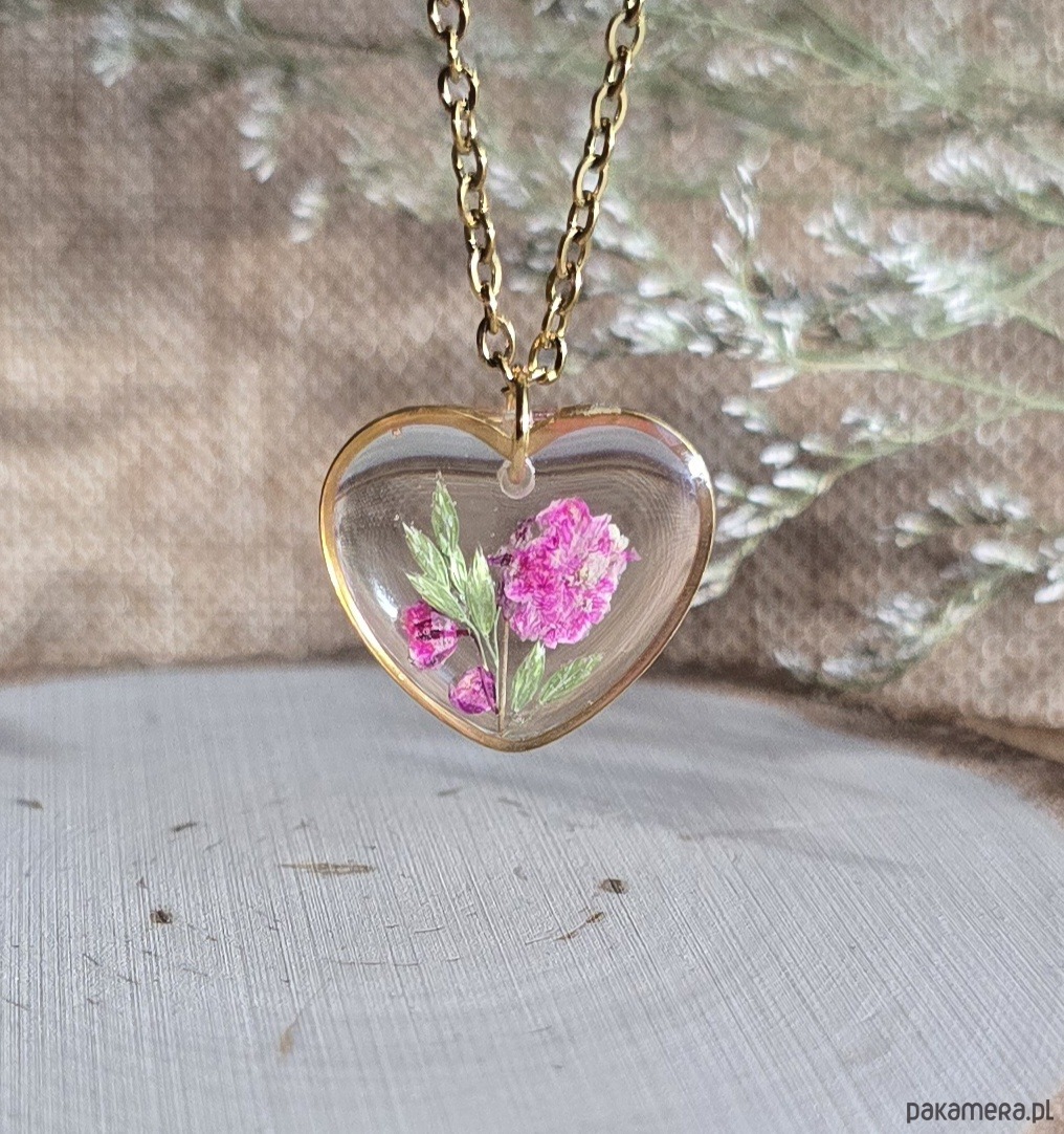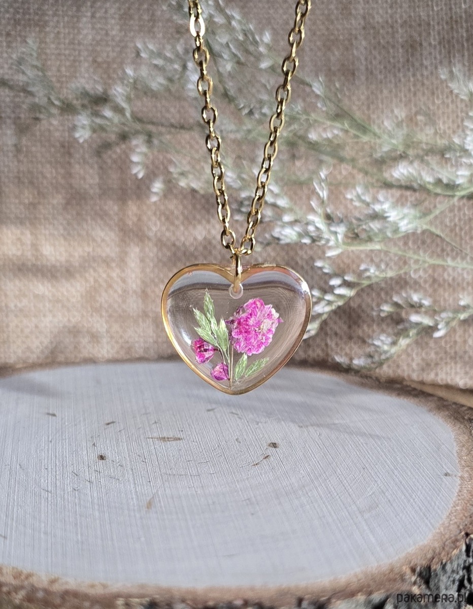 Oferuję Państwu unikalną biżuterię. Zawieszka jest wykonana z suszonych kwiatów i żywicy epoksydowej. Biżuteria jest wspaniałym i oryginalnym prezentem na lata.