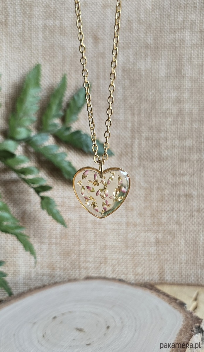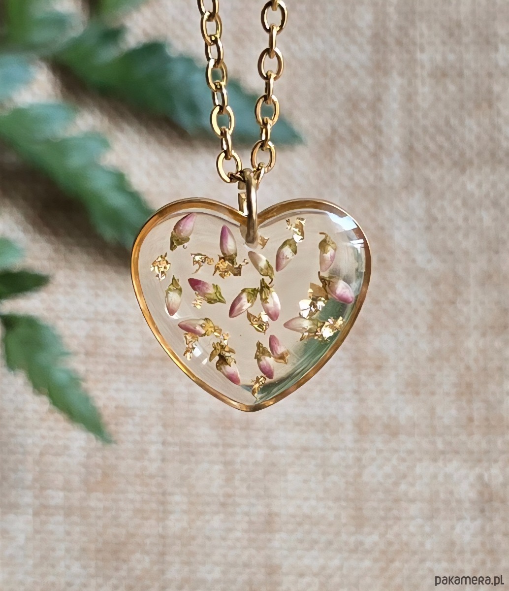 Złota zawieszka wisiorek kwiaty serce serduszko różowy wrzosiec