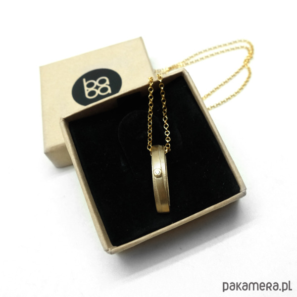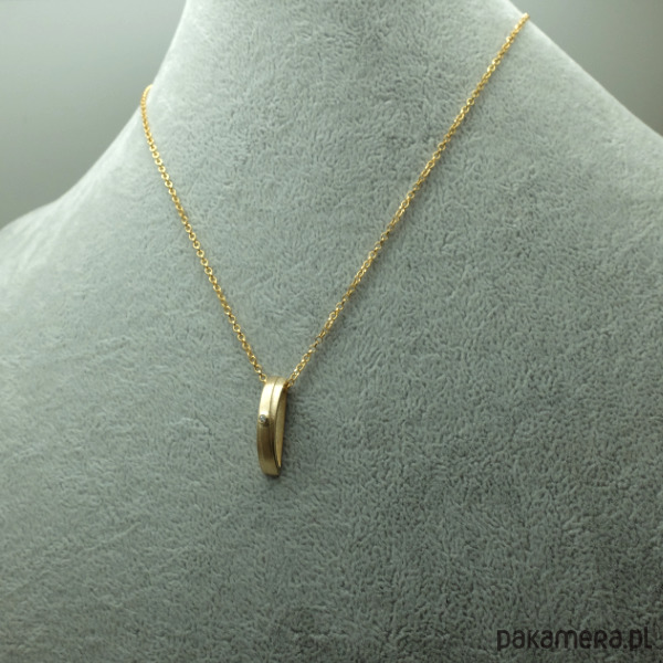 Zawieszka z żółtego złota próby 0,585 (14 karatów) z 2 mm diamentem Si/H. Naszyjnik należy do kolekcji Wstęgi. Łańcuszek ma długość 45 cm. Zawieszka ma wymiary 15 mm x 4mm. Wykonana ręcznie biżuteria idealnie pasuje do pierścionków z tej samej kolekcji. Stanowi elegancki dodatek na co dzień.