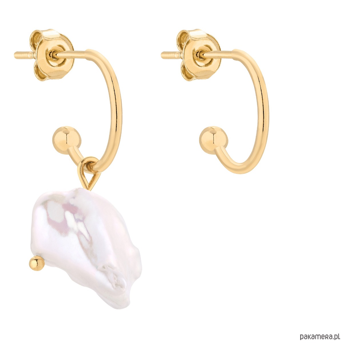 Złote asymetryczne kolczyki z naturalną perłą. Całość wykonana ze srebra 925 powlekanego 24 karatowym żółtym złotem. Perła jest płaska, nieregularna, unikatowa i może różnić się od tej na zdjęciu.