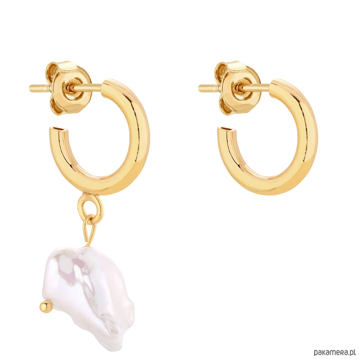 Grube, półokrągłe, złote kolczyki asymetryczne z naturalną perłą. Całość wykonana ze srebra 925 powlekanego 24 karatowym żółtym złotem. Perła jest płaska, nieregularna, unikatowa i może różnić się od tej na zdjęciu.