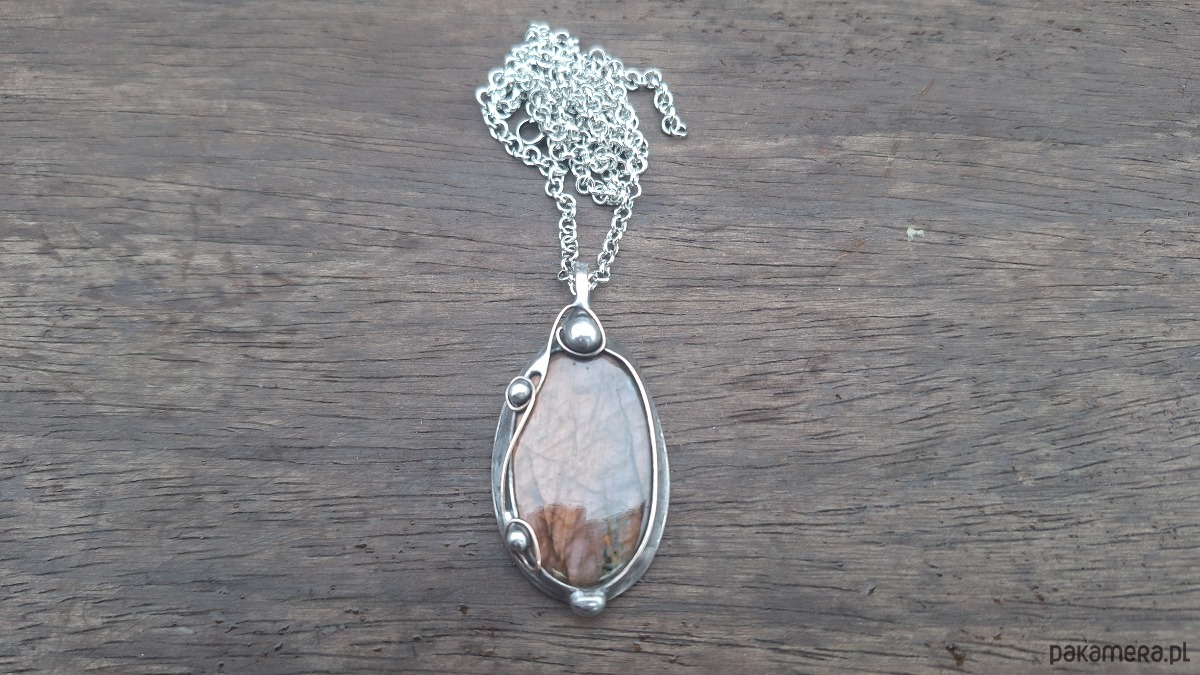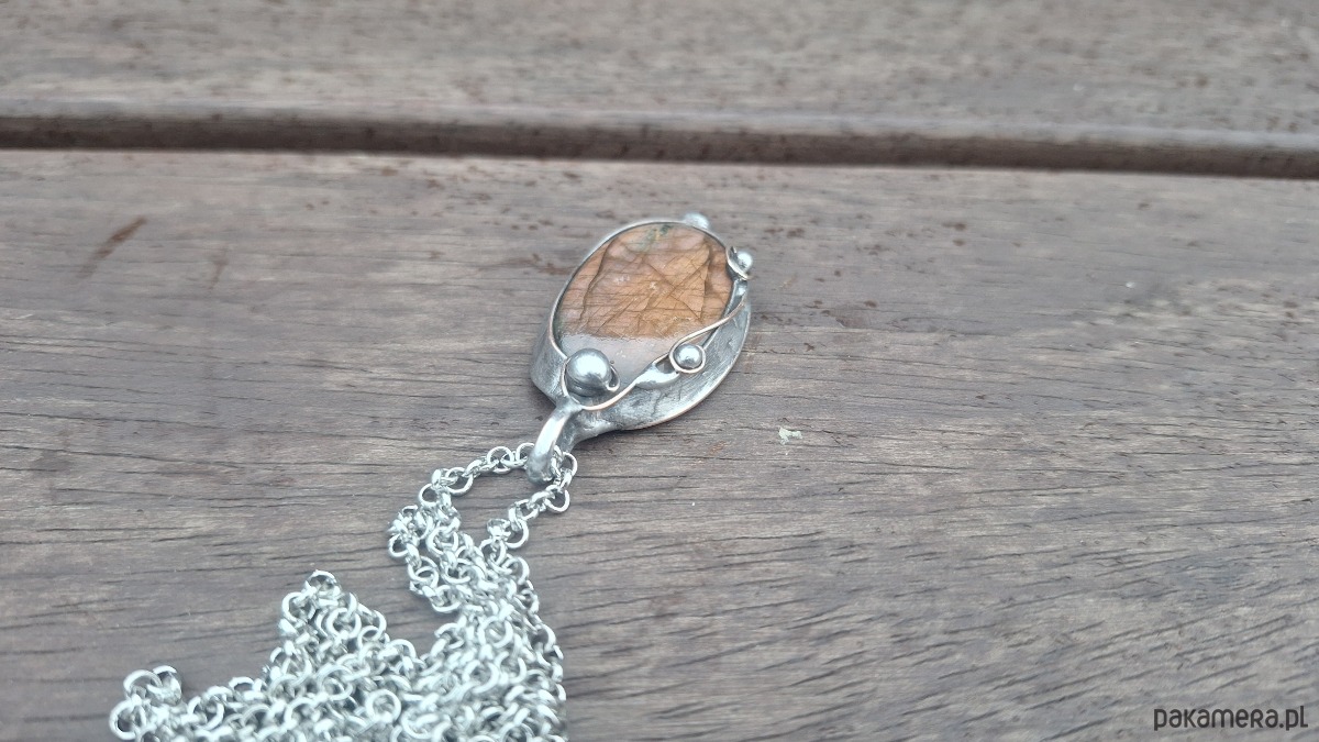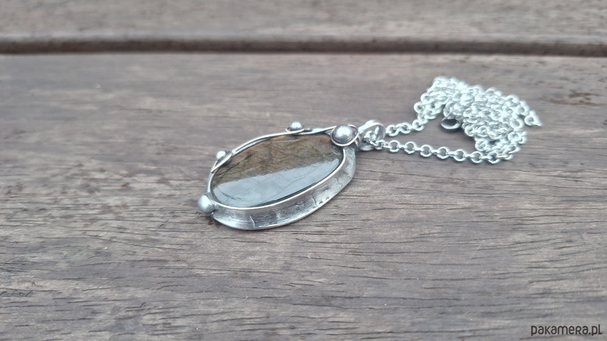 Wisiorek wykonany z miedzi, cyny i labradorytu. Wymiary ok. 4 na 2.2 cm. Zawieszony na łańcuszku o długości ok. 50 cm.