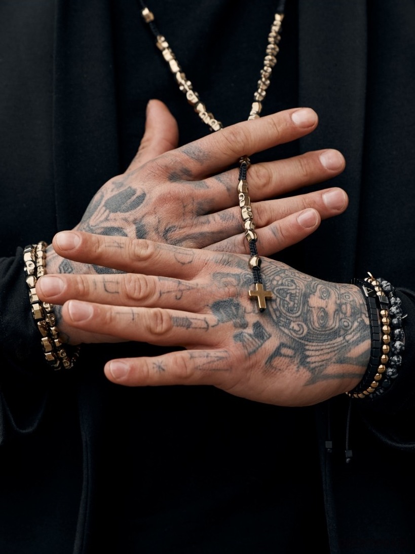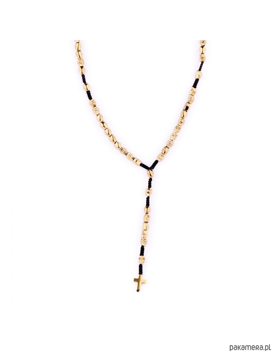 Męski naszyjnik wykonany jest w formie modnego różańca z naturalnego metalizowanego na złoty kolor Hematytu w formie czaszek.