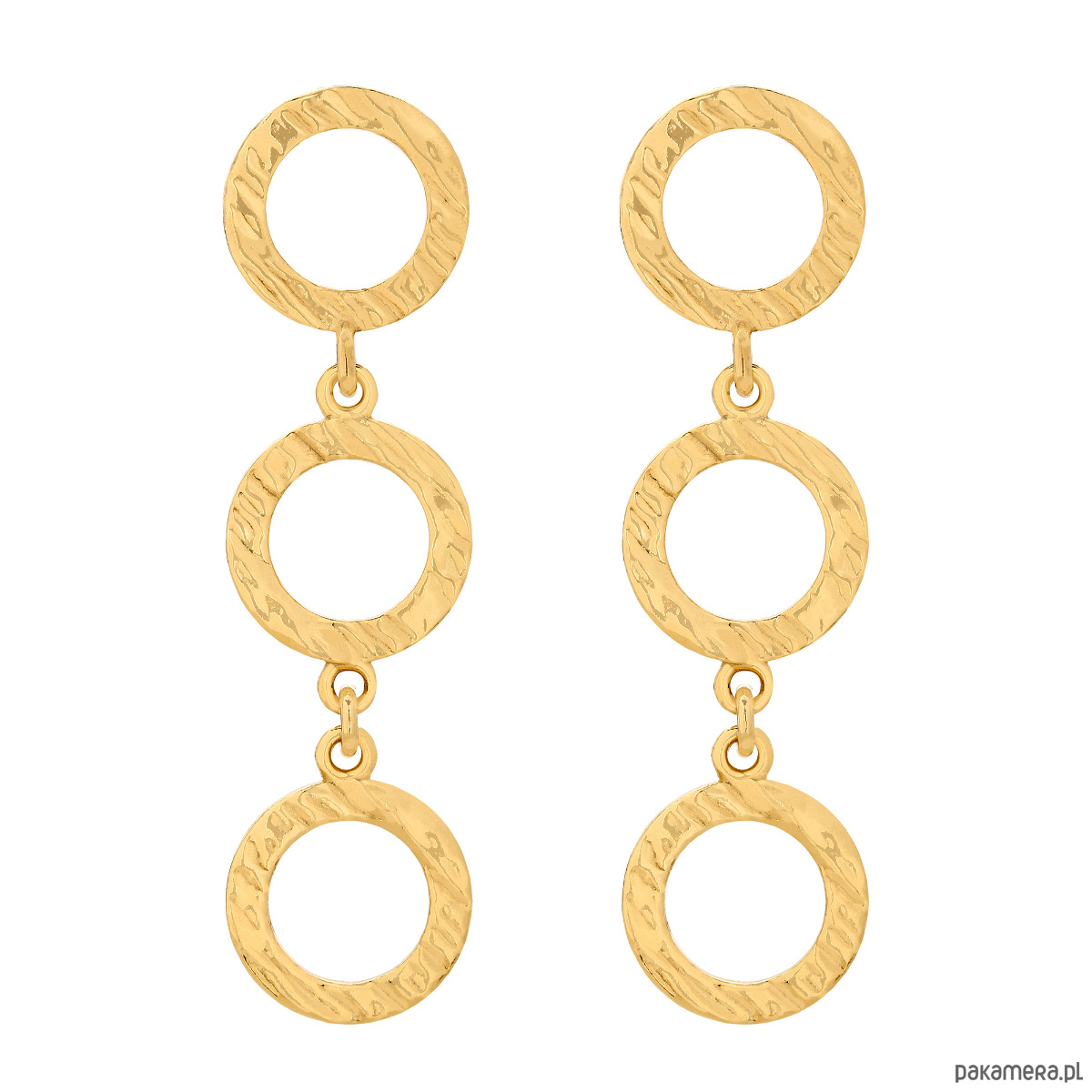 Złote długie kolczyki potrójne chropowate koła. Zapinane na sztyft. Kolczyki posiadają zapięcia (baranki). Całość wykonana ze srebra 925 powlekanego 24 karatowym żółtym złotem.