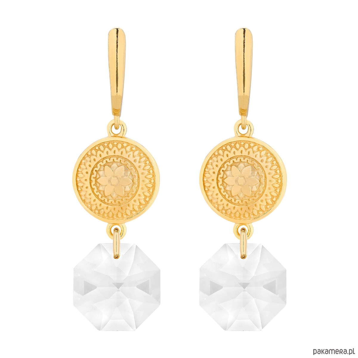 Złote kolczyki wykonane z medalionów i kryształów SWAROVSKI® CRYSTAL w kolorze Crystal. Całość wykonana ze srebra 925 powlekanego 24 karatowym żółtym złotem. Zapinane na bigle angielskie.