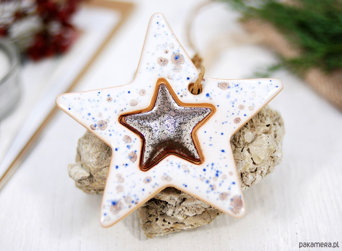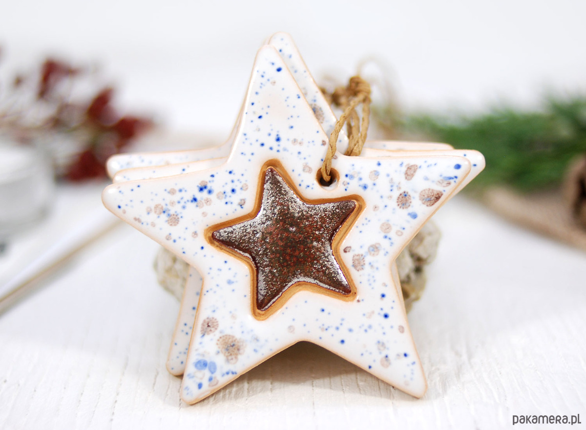 Trzy złoto-białe, ceramiczne gwiazdki choinkowe. Ozdoby są ręcznie robione i szkliwione co gwarantuje ich niepowtarzalność i indywidualny charakter. Można je powiesić klasycznie - na choince, ale pięknie będą się prezentować również w oknie czy na ścianie. Ceramiczne ozdoby to również fajny pomysł na świąteczny prezent dla twoich najbliższych :)