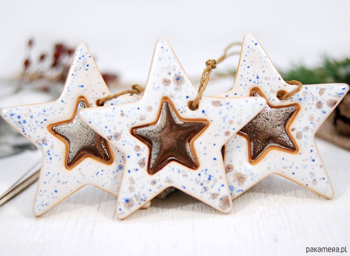 Trzy złoto-białe, ceramiczne gwiazdki choinkowe. Ozdoby są ręcznie robione i szkliwione co gwarantuje ich niepowtarzalność i indywidualny charakter. Można je powiesić klasycznie - na choince, ale pięknie będą się prezentować również w oknie czy na ścianie. Ceramiczne ozdoby to również fajny pomysł na świąteczny prezent dla twoich najbliższych :)